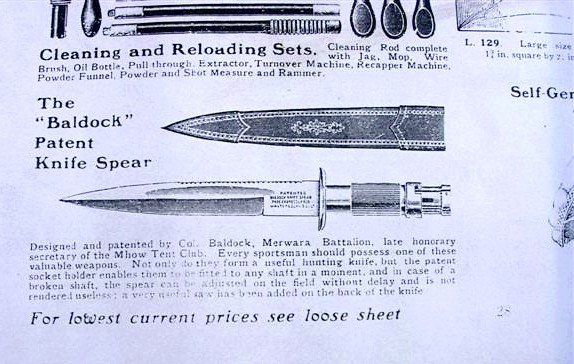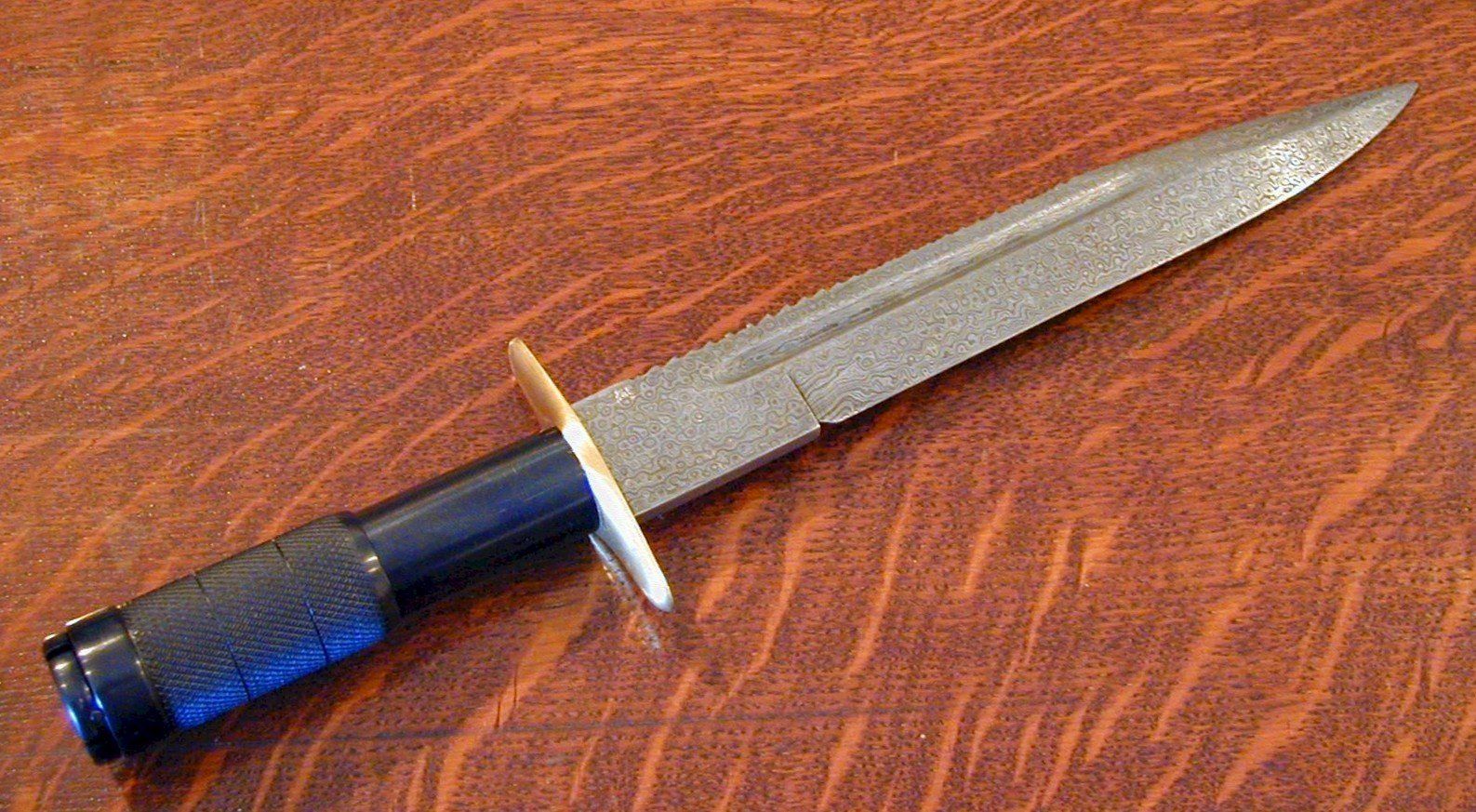 Beautiful hand forged Damascus steel blade with brass guard and blued spring steel handle. This is an exact reproduction of an English survival knife, ca. 1870. The 9 " blade with hollow handle has a special grip feature that facilitates a secure mounting on the end of a shaft to form a spear- simply hack a branch from a tree and slide it into the handle. Ingenious design that is just as useful today as when it was introduced in the mid-1800's. A neat and versatile work horse of a tool with exaggerated serrations on the dorsal side for sawing and elongated double sided sharpened point for thrusting.