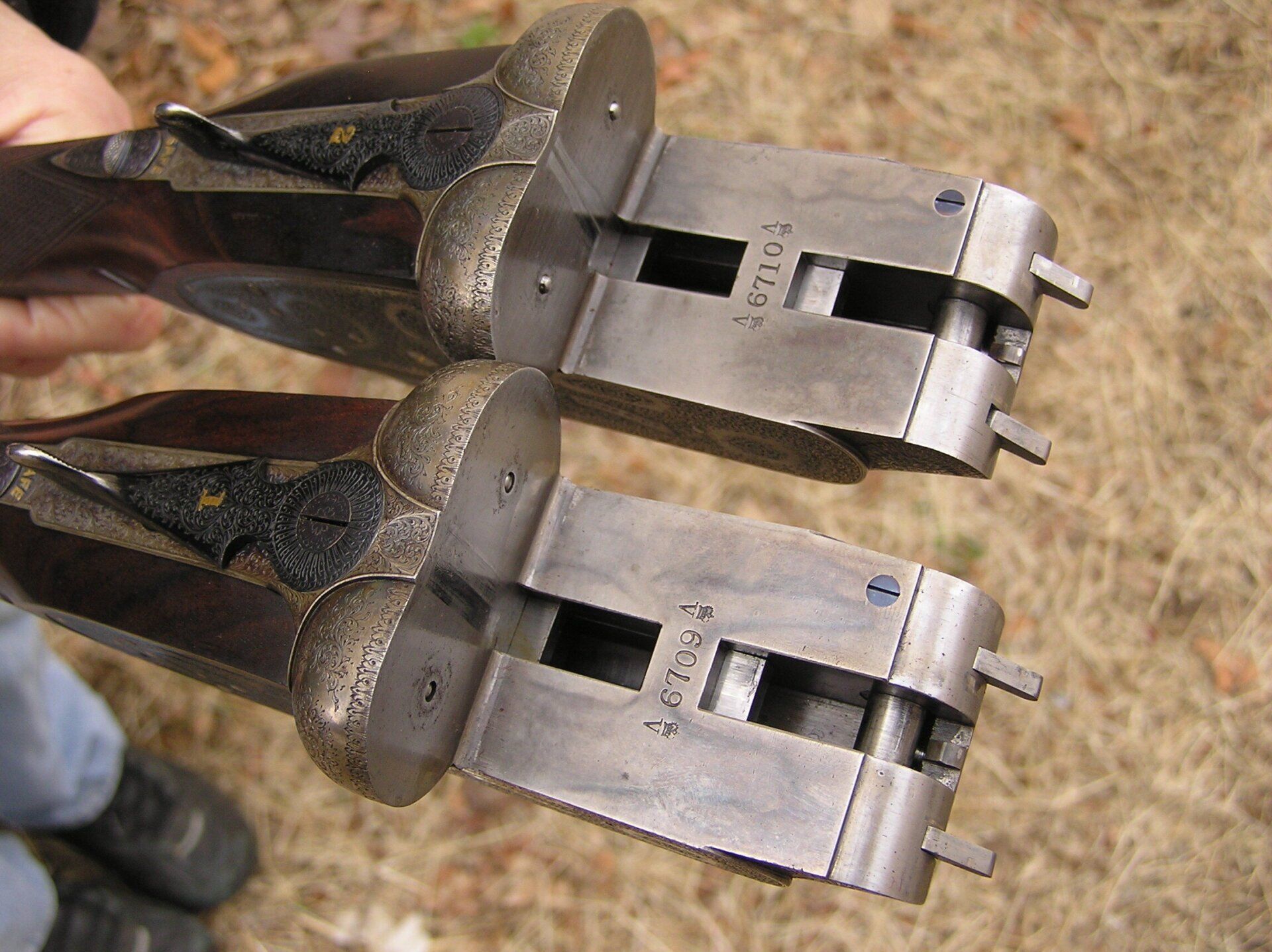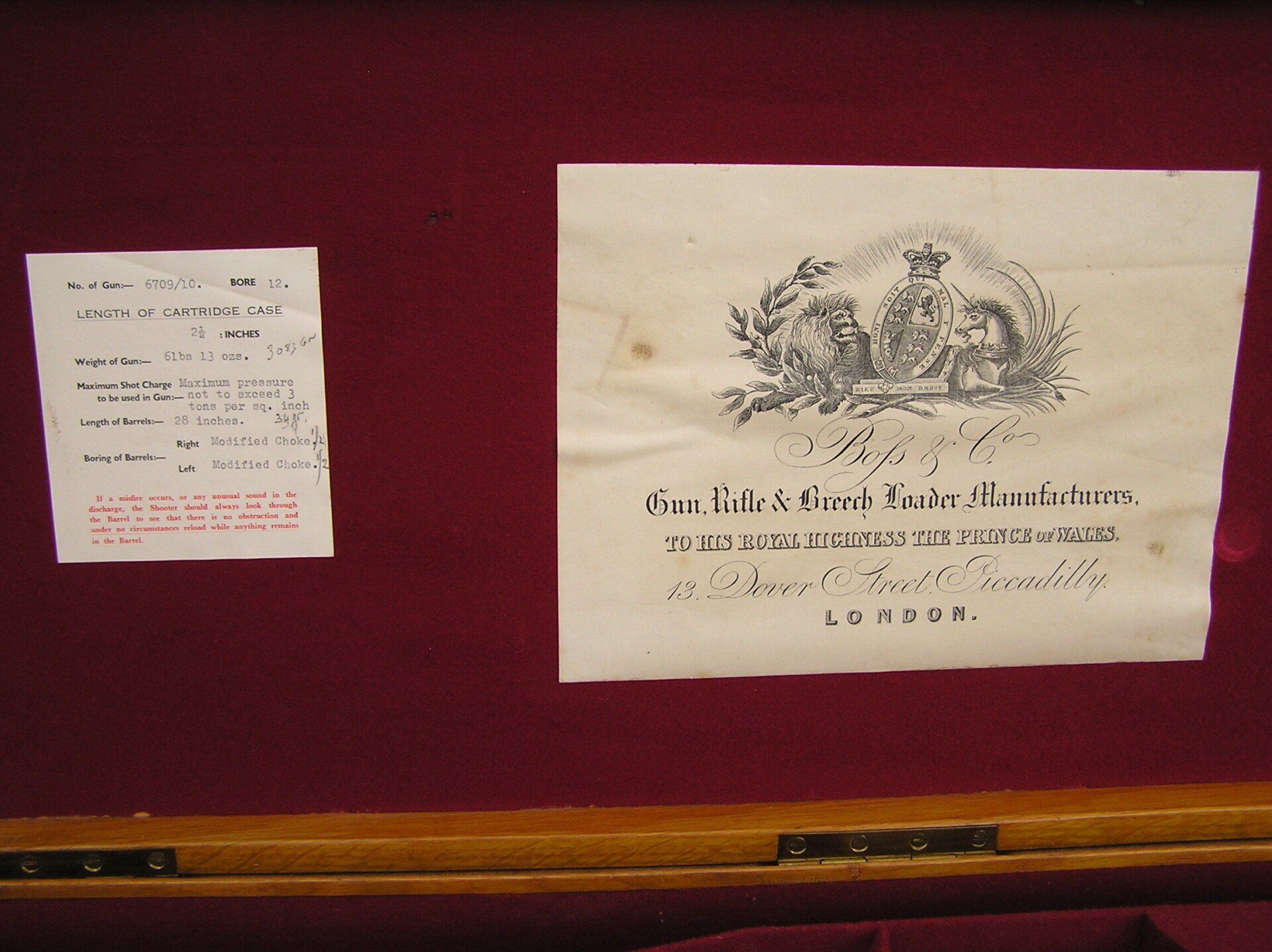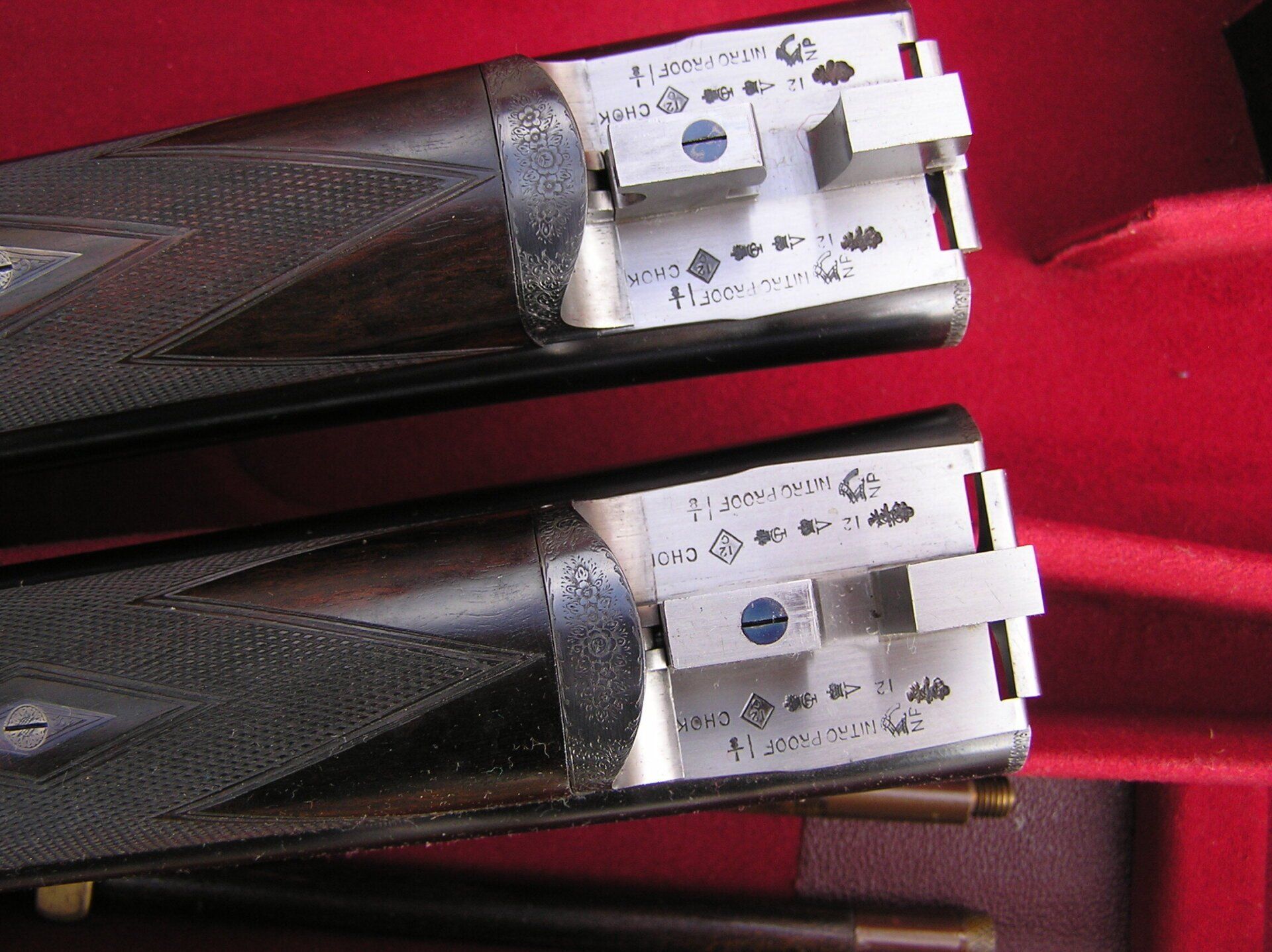 Boss, London. Exceptionally fine matched pair of consecutively numbered vintage light weight assisted-opening 12ga. game guns, #6709-10, made in 1921. Each gun weighs in at just 6 ½ lbs. Stock dimensions: 14 ½”x 1 ¼”x 2 ¼”x 3/8” cast-off. Both guns have superb 28” chopper lump steel barrels with original 2 ½” chambers. Bores are brilliant and absolutely mint, all measuring .728”. All chokes are Modified (½ choke) measuring .023” in each barrel which corresponds to the original specifications from 1921. Wall thicknesses are .034”/.034” in the no.1 gun and .032”/.032” in gun no.2. Best bar-action side lock actions with double underlugs, ejectors, double triggers’ and automatic safety’s. Beautifully engraved actions retain much of the original hardening colors and all engraving is crisp and sharp as if cut yesterday. The barrels retain 98% of the original black finish. Trigger guard tangs have been reblacked but the black on the bows is original. Highly figured matching straight grip stocks with checkered butts and splinter forends retain all the original finish with all checkering sharp showing virtually no use. Original makers case with original labels and some accessories. Overall an absolutely stunning pair of vintage, pre-war, Boss guns remaining in little used near-mint original condition and almost impossible to find in this condition today. Replacement cost today well in excess of $200,000.