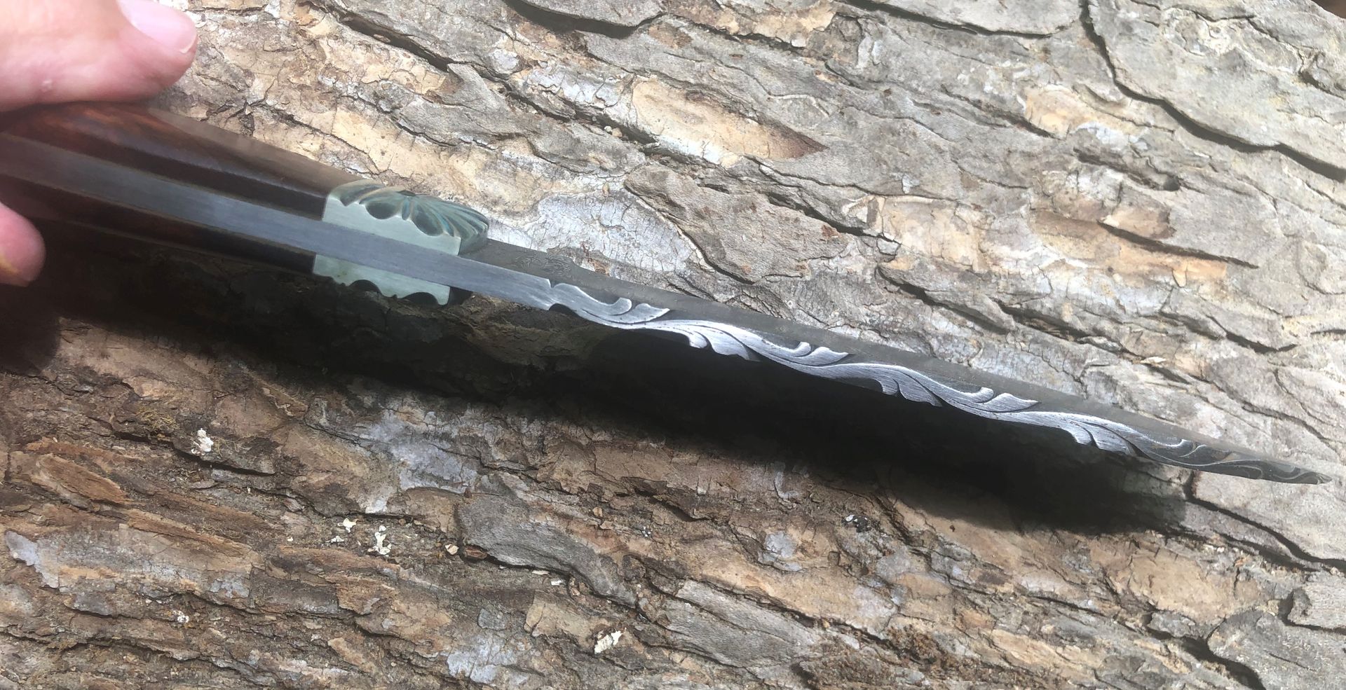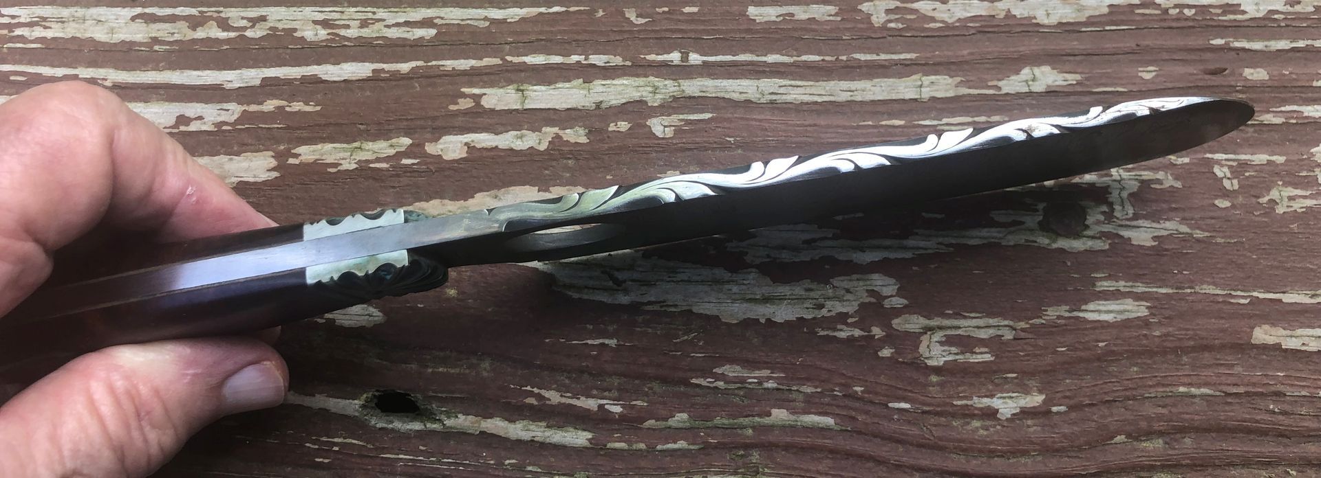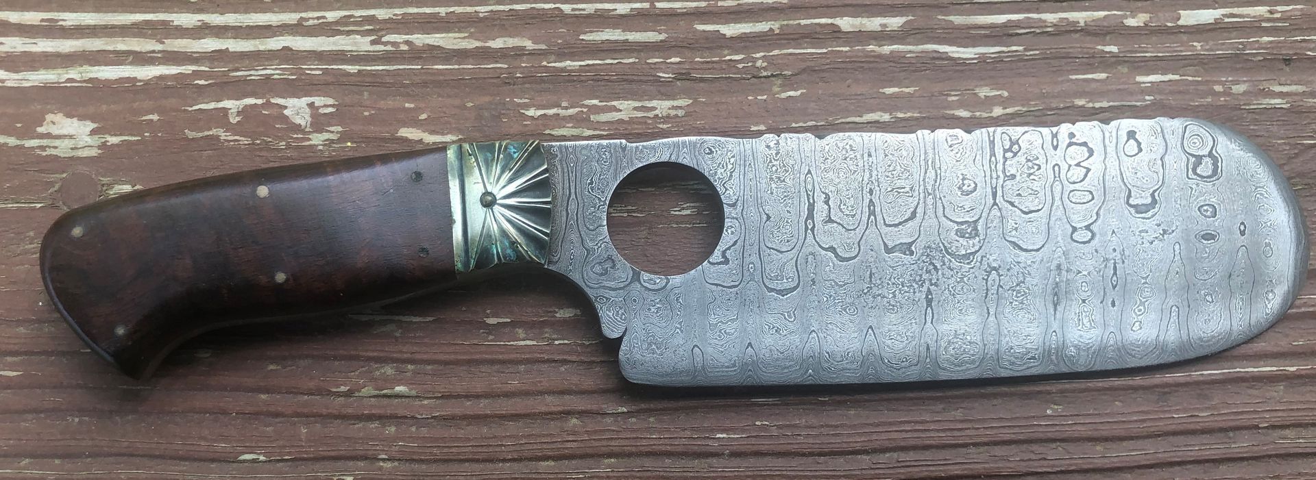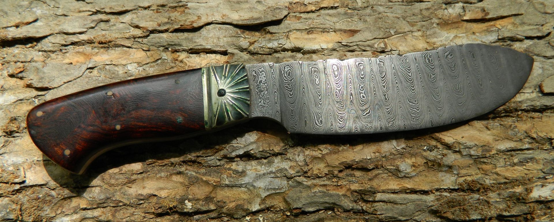 Superb, rare, hand-forged Damascus, “Survival Knife”, made for me around 20 years ago by my Dear Friend, Joe Keeslar. 13 ½” OAL with 8 ½” blade. Ingenious quick-release shoulder sheath for a right-handed person keeps the knife safely and very comfortably tucked away, with handle slanted downward, just beneath your left armpit, out-of-the-way, yet instantly available if the need arises. Great  position for hunting or concealed carry if someone is so inclined. Also, does not interfere with walking through dense brush, climbing into a tree stand, or shooting a longbow from any position. Joe told me he might have made ten or twelve shoulder rigs like this with several different blade styles. Peerless quality in every respect.                                                       Price: $6800