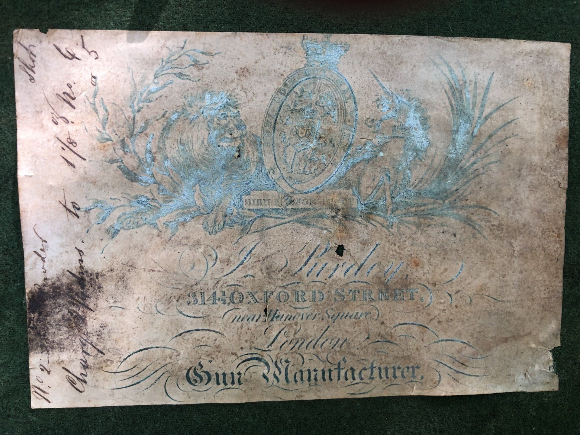 The Purdey 15-bore double flintlock sporting gun, #224, was made for Rev. Edward Missenden Love, Rector of Somersby, Yarmouth, in 1820. According to Purdey records, the gun was,” brought into the Purdey shop by Rev. Love on 17 November 1827 for cleaning and barrel repair at a cost of 5s.0d and 50 flints supplied at 2s.6d.”