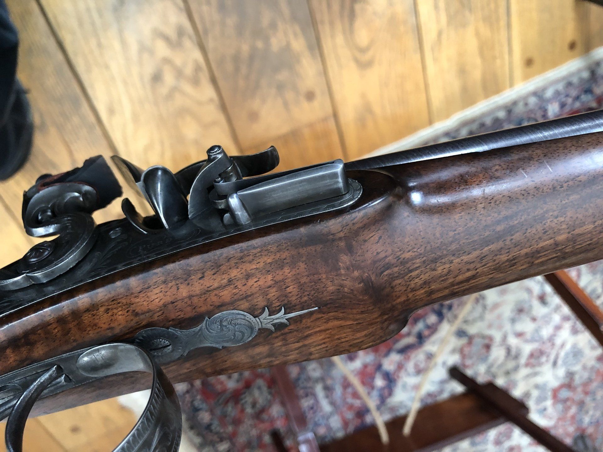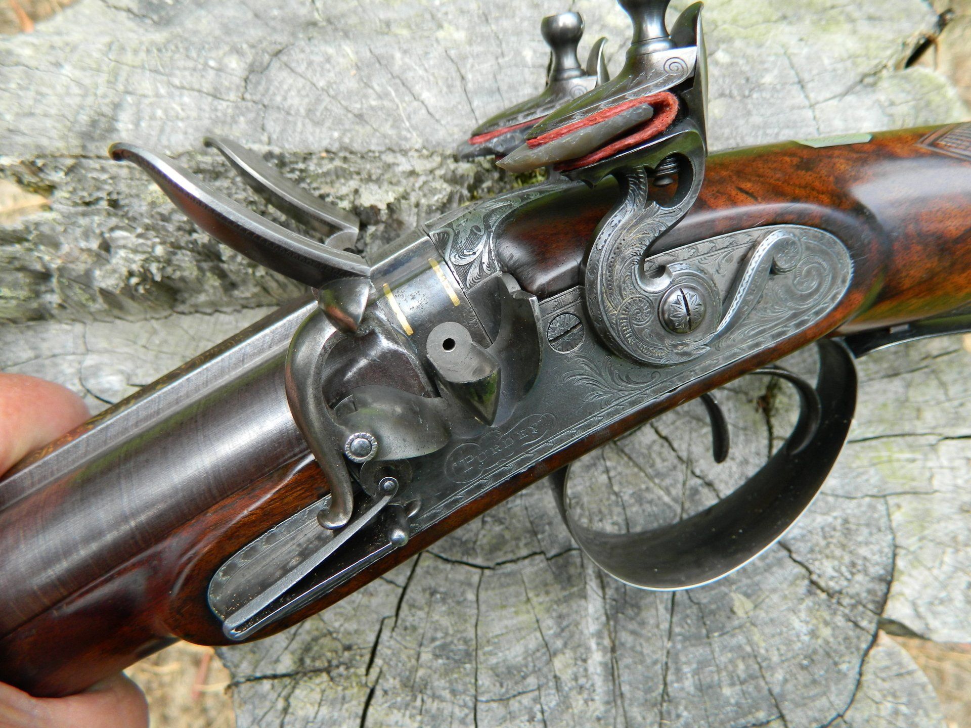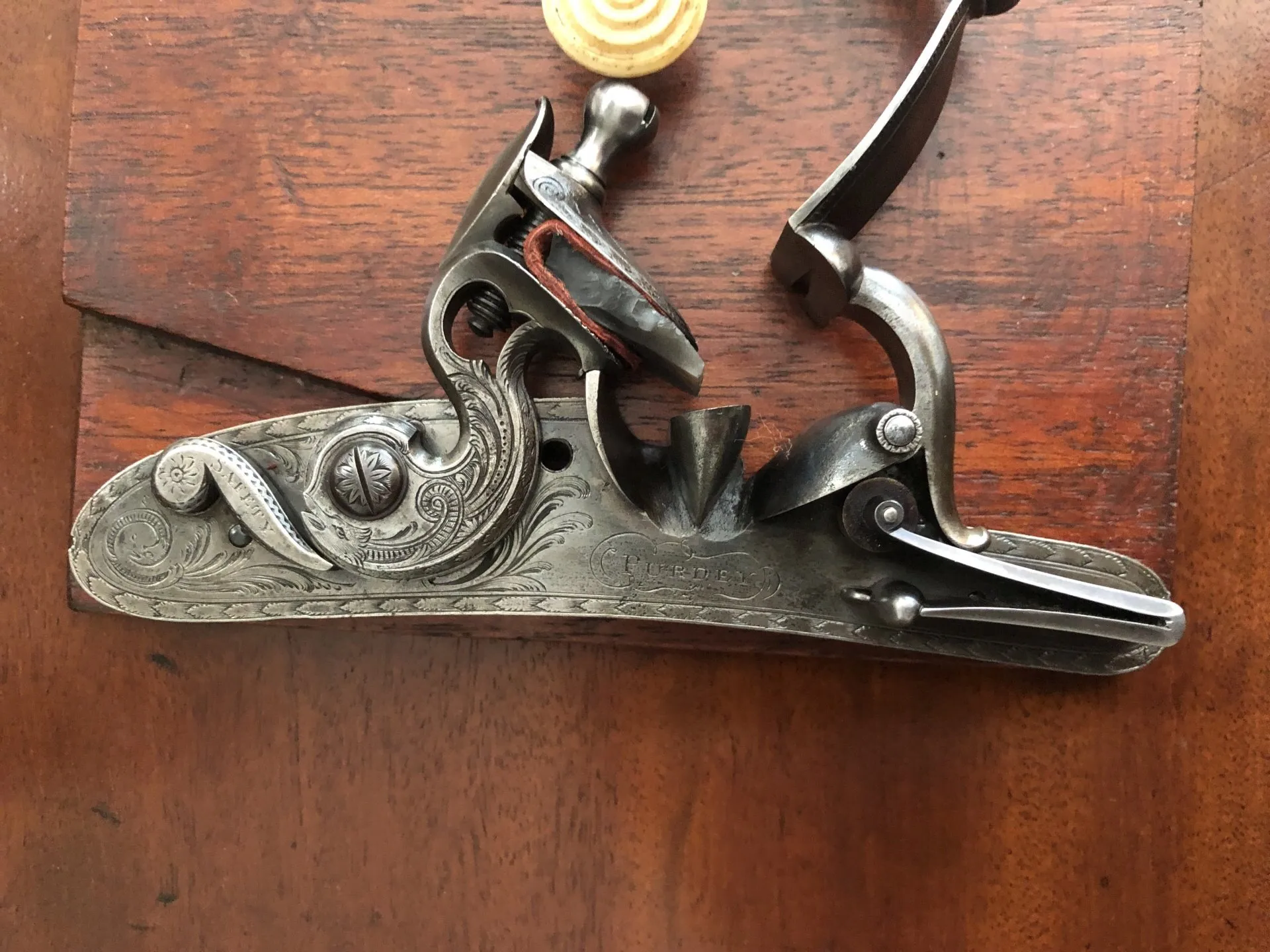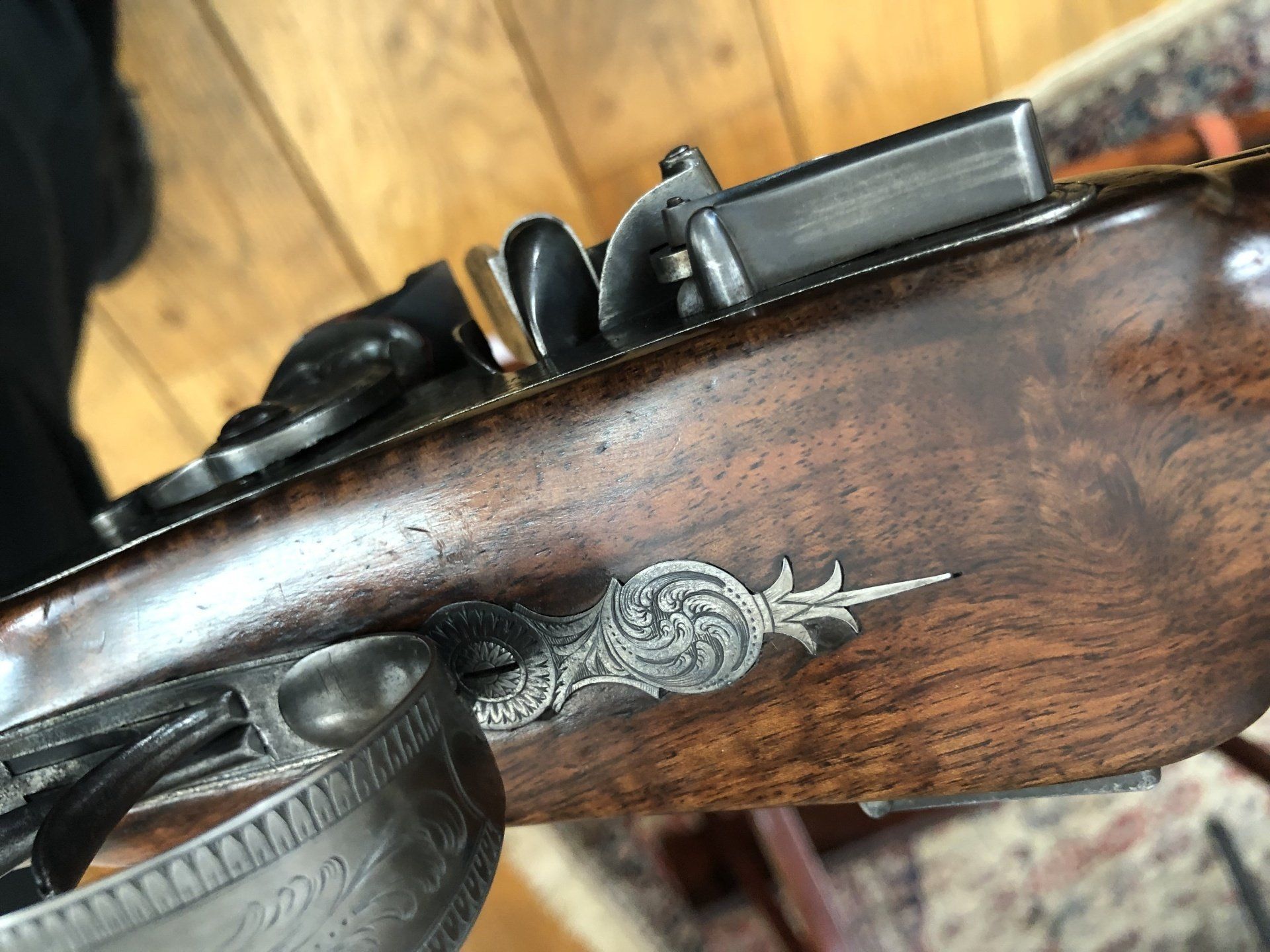Superb 29 ½” barrels by Charles Lancaster have brilliant bores and breaches and appear to retain their original boring (never honed). Bores .678”/.678”, minimum wall thickness at muzzles .030”/.030”. The top rib is “Elevated” just as Purdey’s former employer, Joseph Manton, would have done. The top rib with the Maker’s name elaborately inlaid in gold remains in pristine condition and is quite stunning. The rebrowned barrels have been shortened by ½”, likely in 1827, when according to Purdey records, the gun was, “brought into the Purdey shop by Rev. Love on 17 November 1827 for cleaning and barrel repair and browning at a cost of 5s.0d and 50 flints supplied at 2s.6d.”. The peerless quality locks, with all original internal parts including the extremely stout mainsprings, feature Purdey’s Patent grip-safety lever hinged to the rear trigger guard tang which actuates the external safety sears. I find it fascinating that this exact same feature is still used on virtually all Best Guns produced 200 years later, the only difference being that the safety sears of today act internally on the tumbler as opposed to operating externally on the cock. Also, note the typical early Purdey marrow-spoon pans, tilted back toward the flint, presumably to provide slightly more rapid ignition. The open-throat cock with the “double-chin “beneath the lower jaw which impinges on the top of the flash guard provides for greater strength to the cock and internal lock parts by allowing better distribution of the forces when the exceptionally powerful mainspring is unleashed. The “Sea Serpent” engraving was typical of the earliest Purdey guns and was executed by the same fellow who employed the same motifs on numerous fine guns turned out by Joe Manton during that period. The stock, with a minor, barely visible, repair to the left side of the forend, is the most beautifully figured of any I can ever remember seeing on a British firearm from any period!