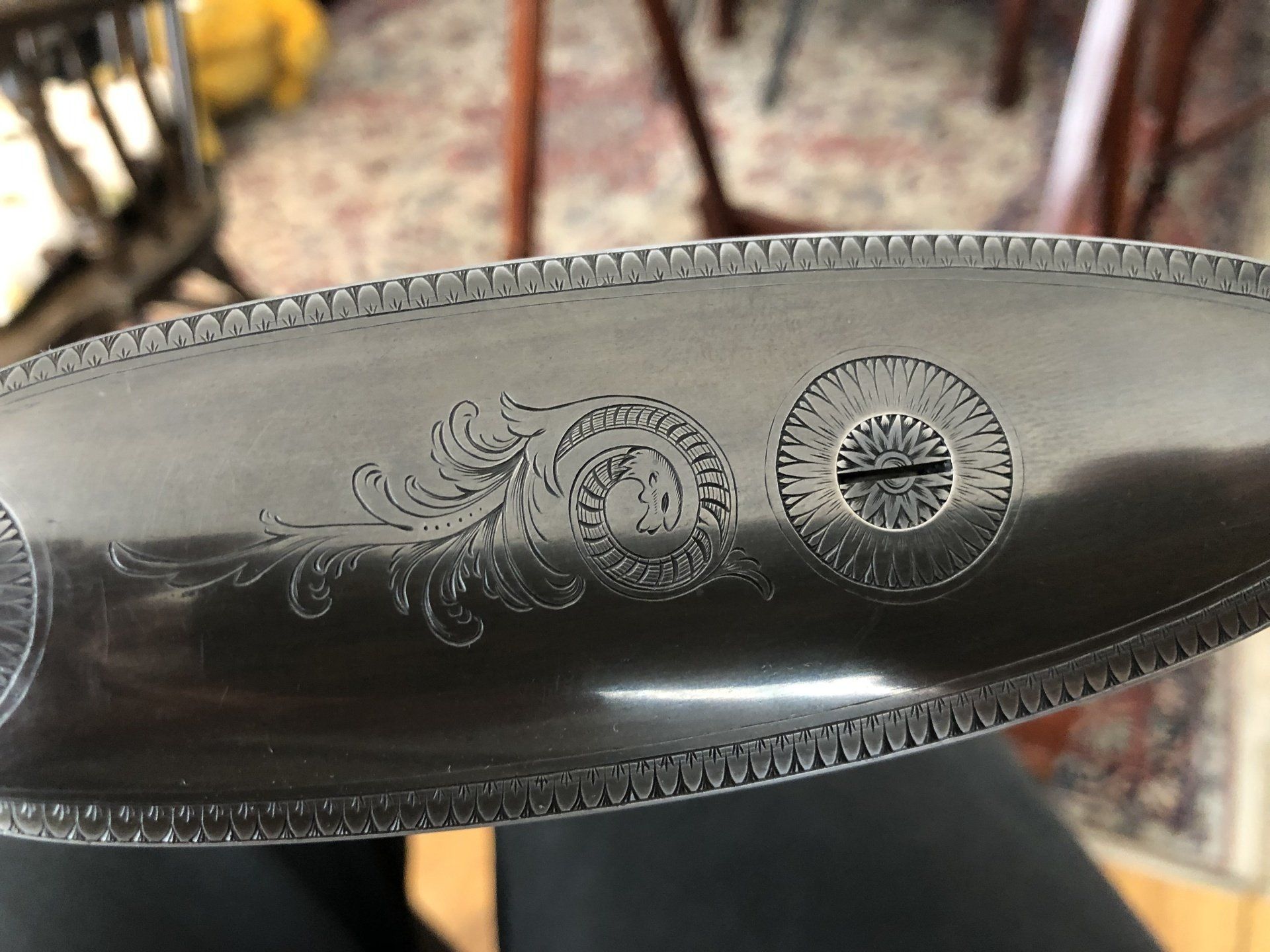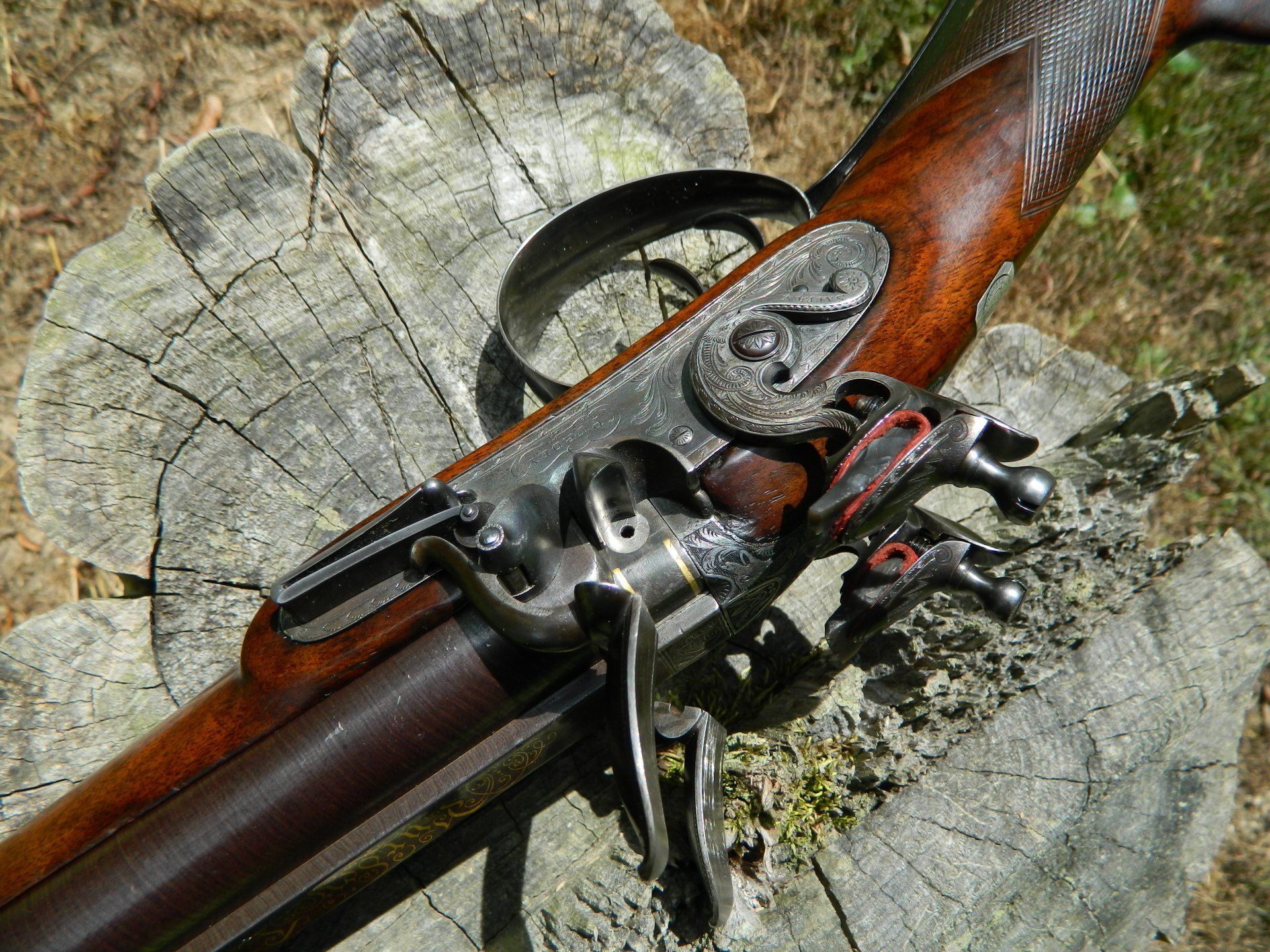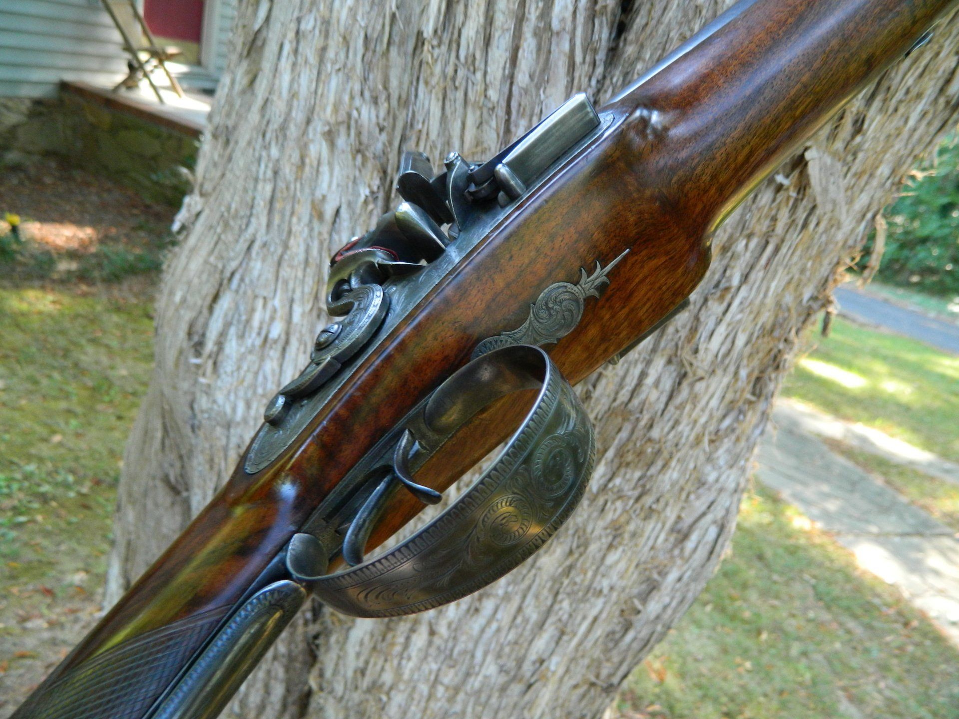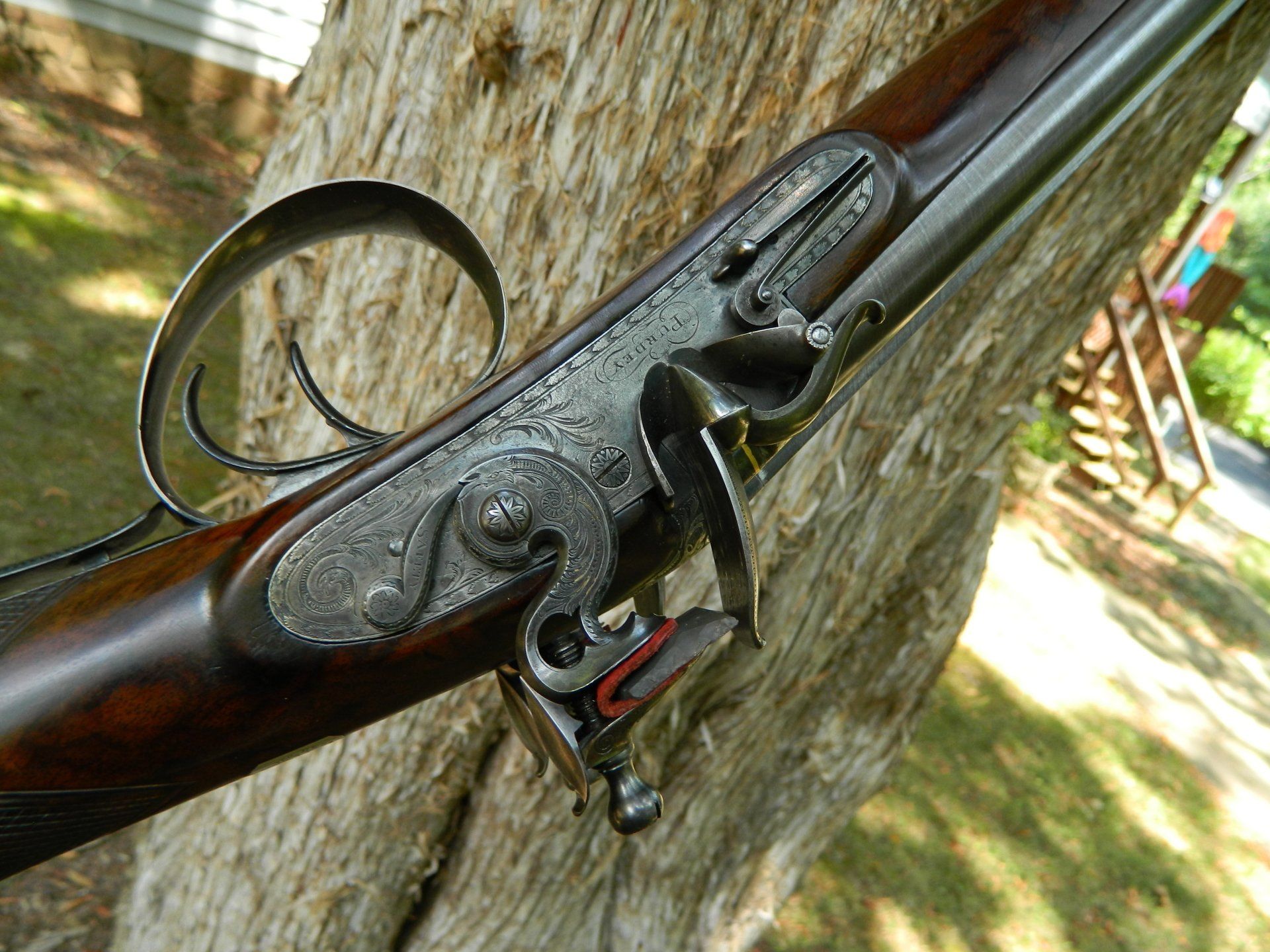Superb 29 ½” barrels by Charles Lancaster have brilliant bores and breaches and appear to retain their original boring (never honed). Bores .678”/.678”, minimum wall thickness at muzzles .030”/.030”. The top rib is “Elevated” just as Purdey’s former employer, Joseph Manton, would have done. The top rib with the Maker’s name elaborately inlaid in gold remains in pristine condition and is quite stunning. The rebrowned barrels have been shortened by ½”, likely in 1827, when according to Purdey records, the gun was, “brought into the Purdey shop by Rev. Love on 17 November 1827 for cleaning and barrel repair and browning at a cost of 5s.0d and 50 flints supplied at 2s.6d.”. The peerless quality locks, with all original internal parts including the extremely stout mainsprings, feature Purdey’s Patent grip-safety lever hinged to the rear trigger guard tang which actuates the external safety sears. I find it fascinating that this exact same feature is still used on virtually all Best Guns produced 200 years later, the only difference being that the safety sears of today act internally on the tumbler as opposed to operating externally on the cock. Also, note the typical early Purdey marrow-spoon pans, tilted back toward the flint, presumably to provide slightly more rapid ignition. The open-throat cock with the “double-chin “beneath the lower jaw which impinges on the top of the flash guard provides for greater strength to the cock and internal lock parts by allowing better distribution of the forces when the exceptionally powerful mainspring is unleashed. The “Sea Serpent” engraving was typical of the earliest Purdey guns and was executed by the same fellow who employed the same motifs on numerous fine guns turned out by Joe Manton during that period. The stock, with a minor, barely visible, repair to the left side of the forend, is the most beautifully figured of any I can ever remember seeing on a British firearm from any period!