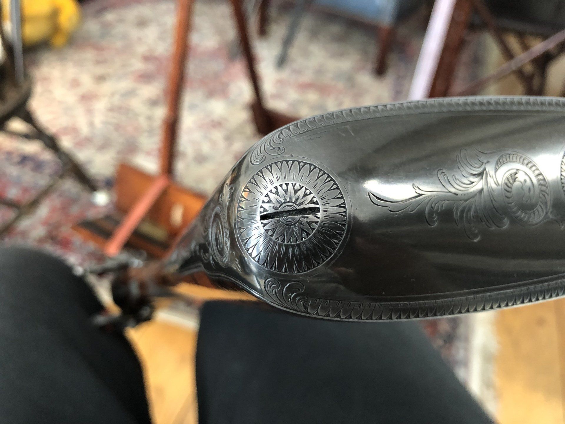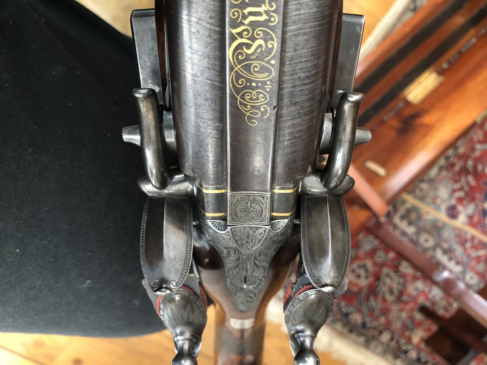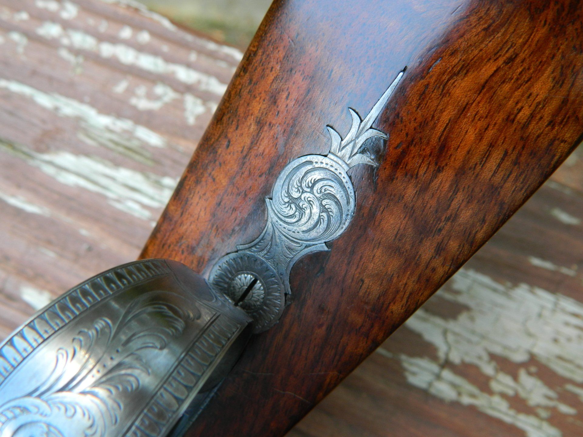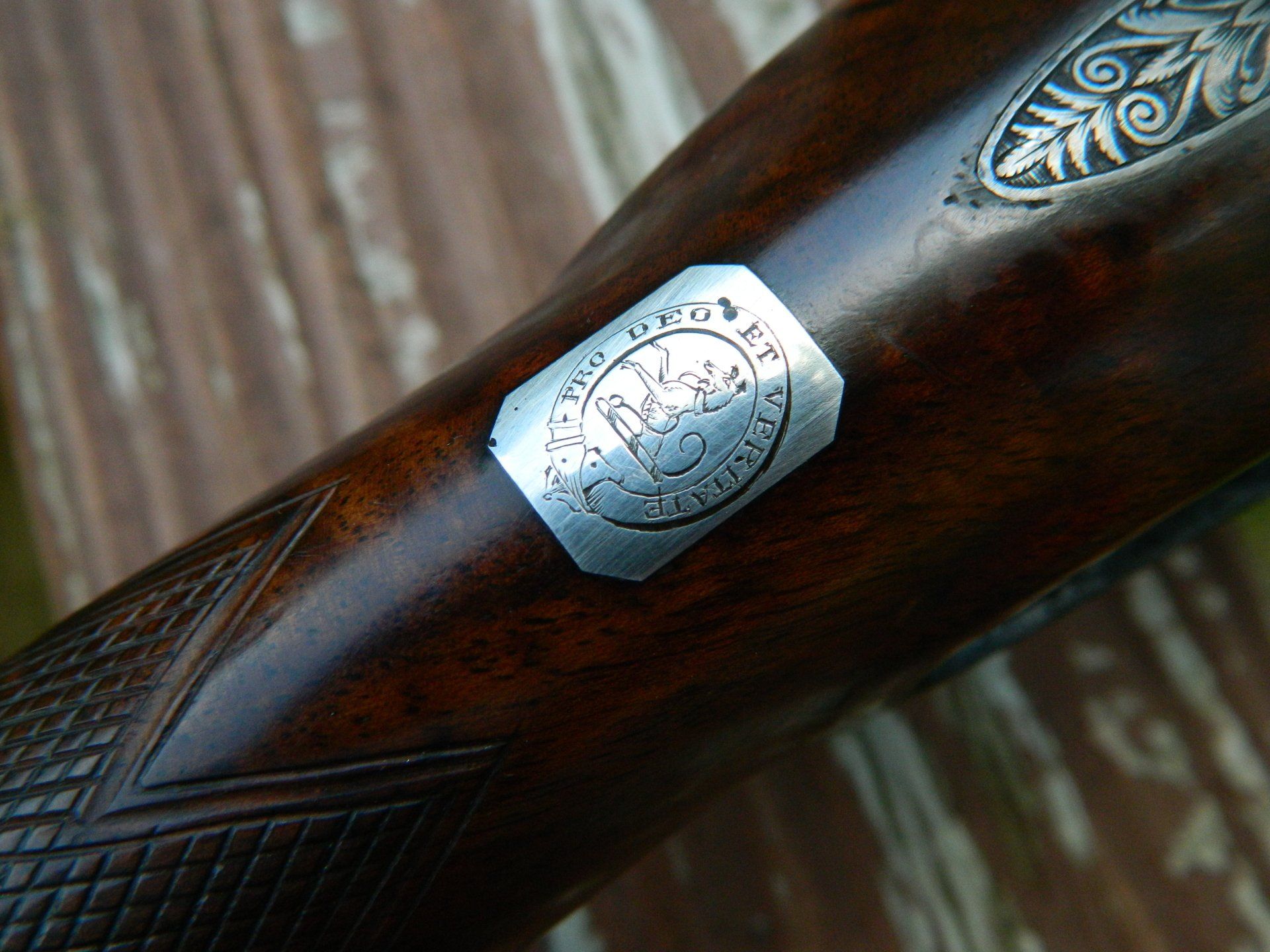 Interestingly, the gun was, “brought into the Purdey shop by Rev. Love on 17 November 1827 to be cleaned for 5s0d, the barrels repaired and rebrowned for 15s0d and was supplied with 50 flints for 2s6d”. That last quote was from Richard Beaumont’s excellent book entitled, “The Early Purdey’s”, which actually identifies the owner as, Rev. Edward Missenden Lane, and is either a misprint or simply an error in transcription from the early record book as the silver wrist escutcheon on #224, with the Family Crest of the lined Greyhound surmounted by the Latin inscription, “pro deo et veritate”, translated as, “For God and Truth”, has been well documented by other sources as that belonging to Missenden Love rather than Lane.