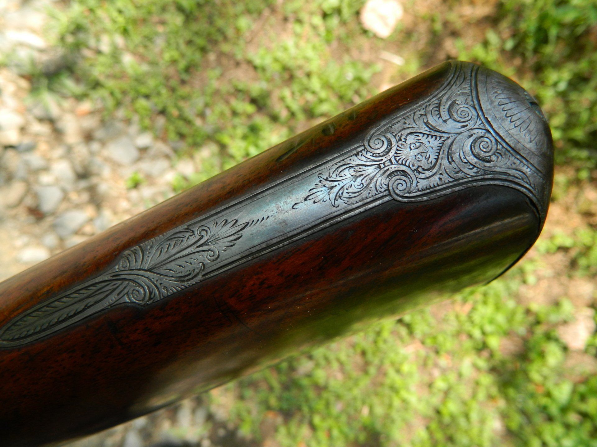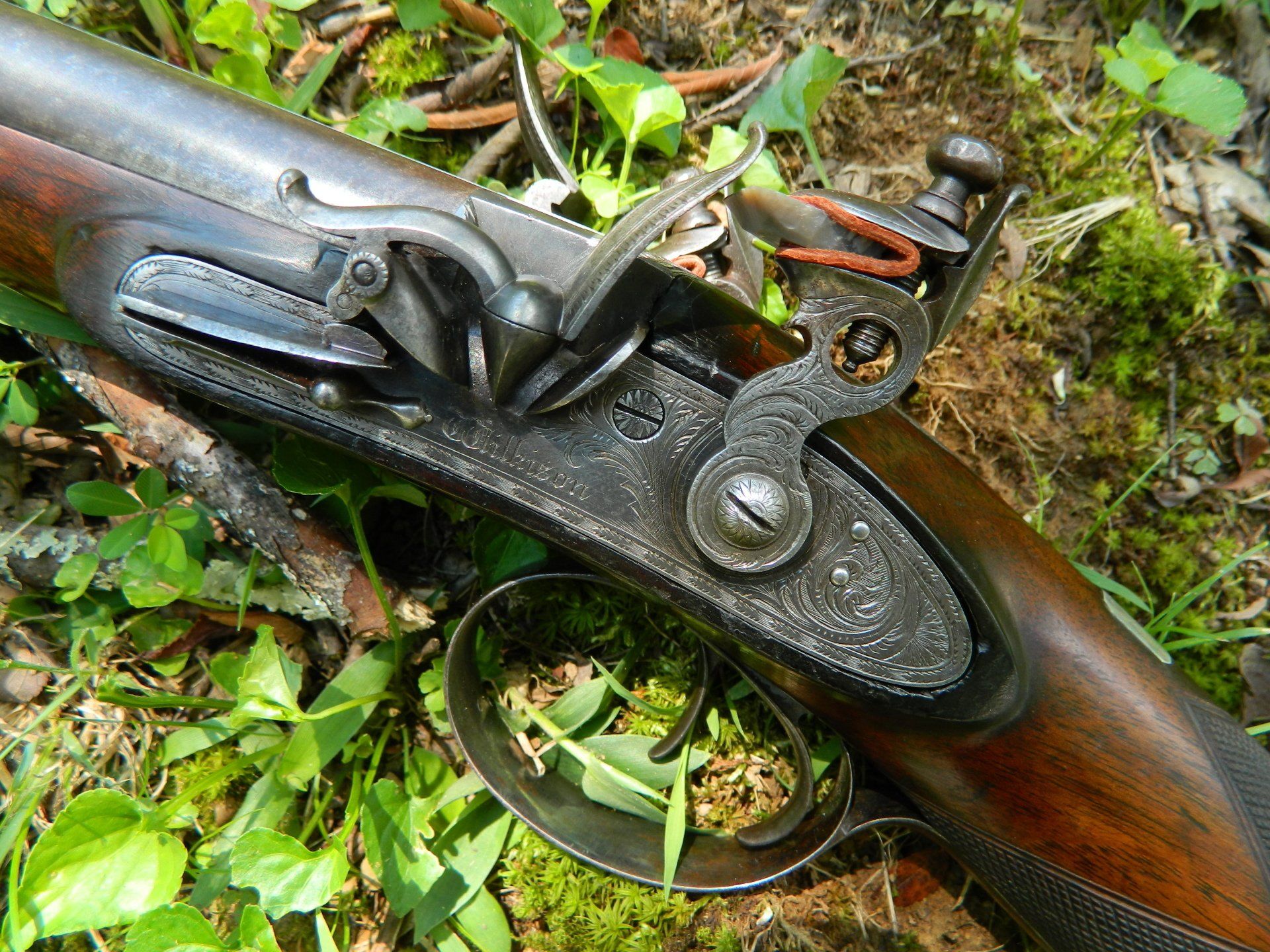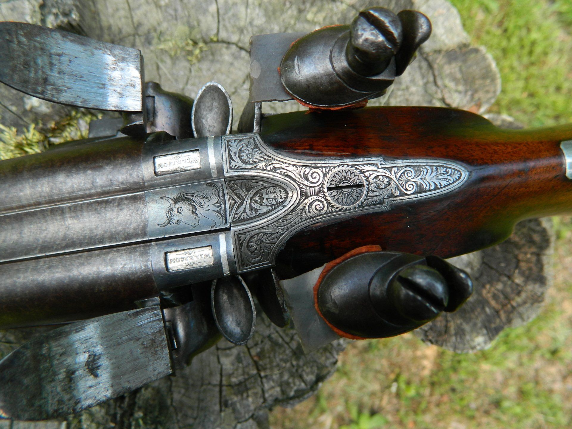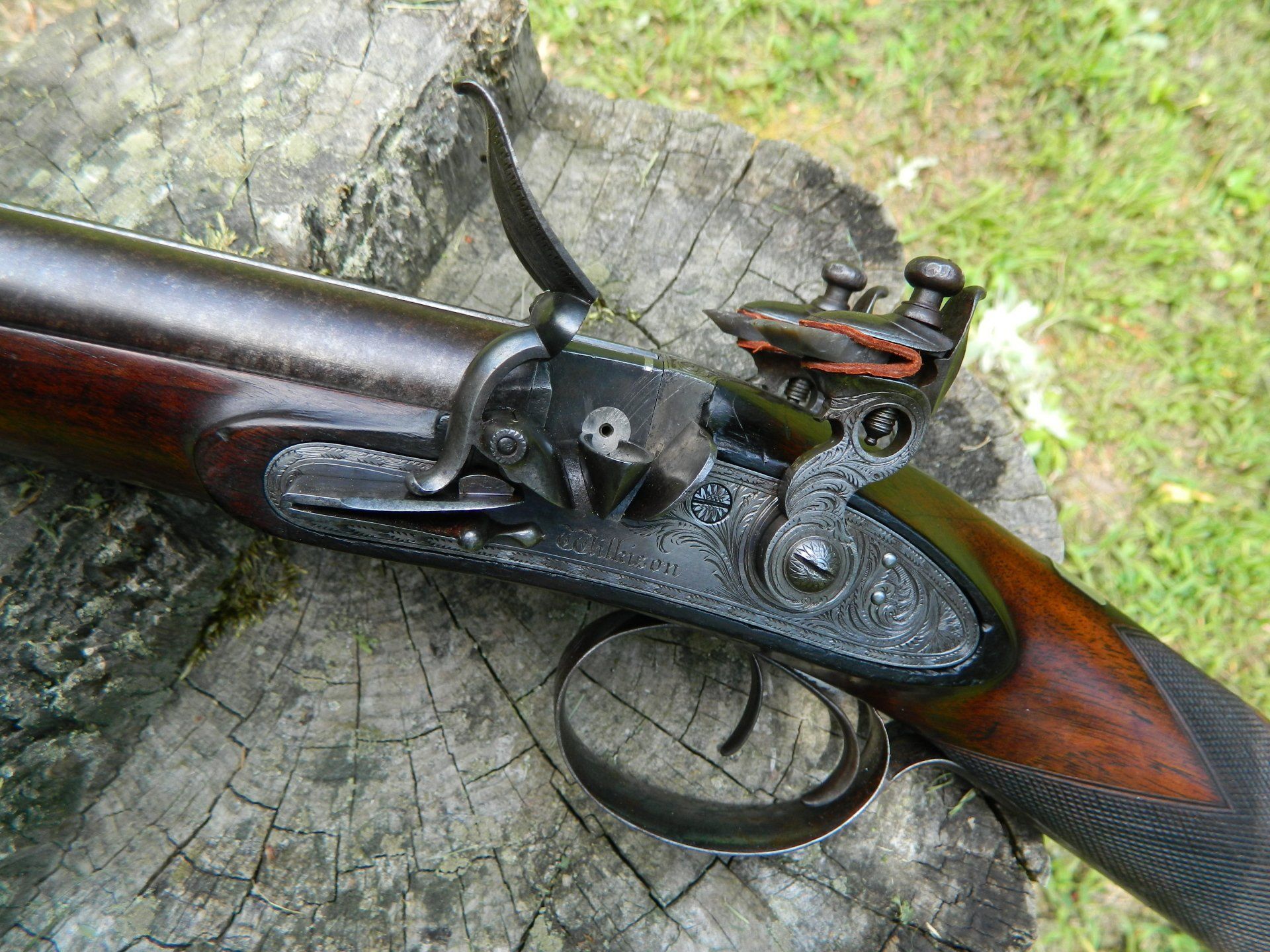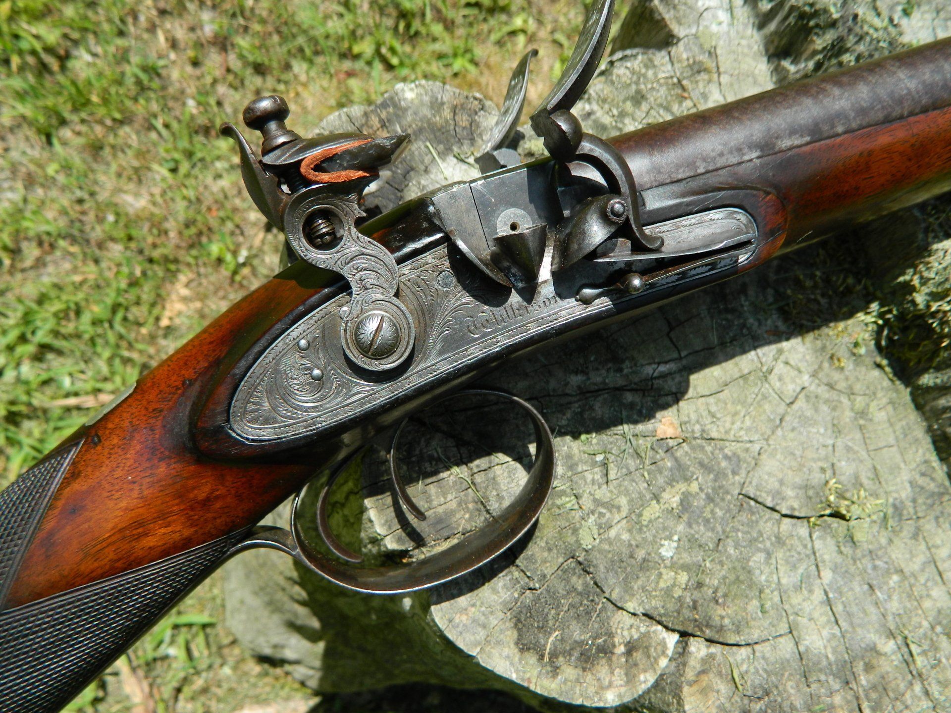 John Manton and Son, London. An absolutely stunning 14-bore, cased double barreled, Flintlock Sporting Gun, #10571, made in 1830 for the Earl of Plymouth, Robert Henry Clive (1789-1854), grandson of Robert Clive (1725-1774) who was also known as "Clive of India". Weight: 7 lbs. Stock dimensions: 14 ¼" LOP. Superb 31 3/4" Damascus barrels with absolutely pristine breeches, unaltered bores (.701"/.701"), and thick walls (.056"/.056") at the muzzles, retaining most of the original external finish. Stepped-in breeches engraved and with platinum lines inlaid fore-and-aft also have platinum-lined touch holes and retain much of the original hardening colors. The ramrod is original as is the spare that accompanies the gun. The peerless quality locks, retaining much original finish have deep-V pans (without platinum divider bars) and gooseneck cocks. The hammers have been struck a few times but, like the breeches, show little-or-no evidence of ever being used in the field. Absolutely mechanically perfect with extremely powerful main and feather springs as you would expect from this Maker! Beautifully engraved iron mounts retain much of the original dark blue finish with some of the finish worn off the trigger guard tang and butt plate. Nicely figured walnut stock has a few handling marks and a minor repair to the mortise just above the bar of the right lock. Overall the stock retains virtually all the original finish with sharp, crisp, checkering at the wrist. Silver wrist escutcheon, showing no wear, is engraved with a griffin and torse over the owners initials, "RHC". The whole in the original mahogany case with a complete compliment of original accessories including spare ramrod, stout 3-piece loading rod, Hawksley pigskin leather-covered powder flask signed in ink by hand, " G.H.W. Windsor-Clive", over an abbreviation for the Coldstream Guards referring to Lieutenant Colonel George Herbert Windsor Windsor-Clive (1835-1918), the second son of Robert Clive and younger brother of the original owner. Also included in the case are a leather flint wallet containing spare flints and two spare side nails, wad punch, double turnscrew, pan brush, and original key to the case ... all in fine condition. Overall a magnificent, incredibly rare, original set, with impeccable provenance, mechanically absolutely perfect, the whole remaining in superb condition throughout, and suitable for the finest collection or use in the field today. Not likely you will ever see a finer example offered for sale !! Provenance: Made in 1830 for the Earl of Plymouth, Robert Henry Clive (1789-1854), grandson of Robert Clive (1725-1774) who was also known as "Clive of India". Purchased by my friend, Norm Blank, around 1962 directly from the Earl of Plymouth's estate in a sale facilitated by Keith Neal. Ownership passed to Lewis Drake in 2023. SOLD