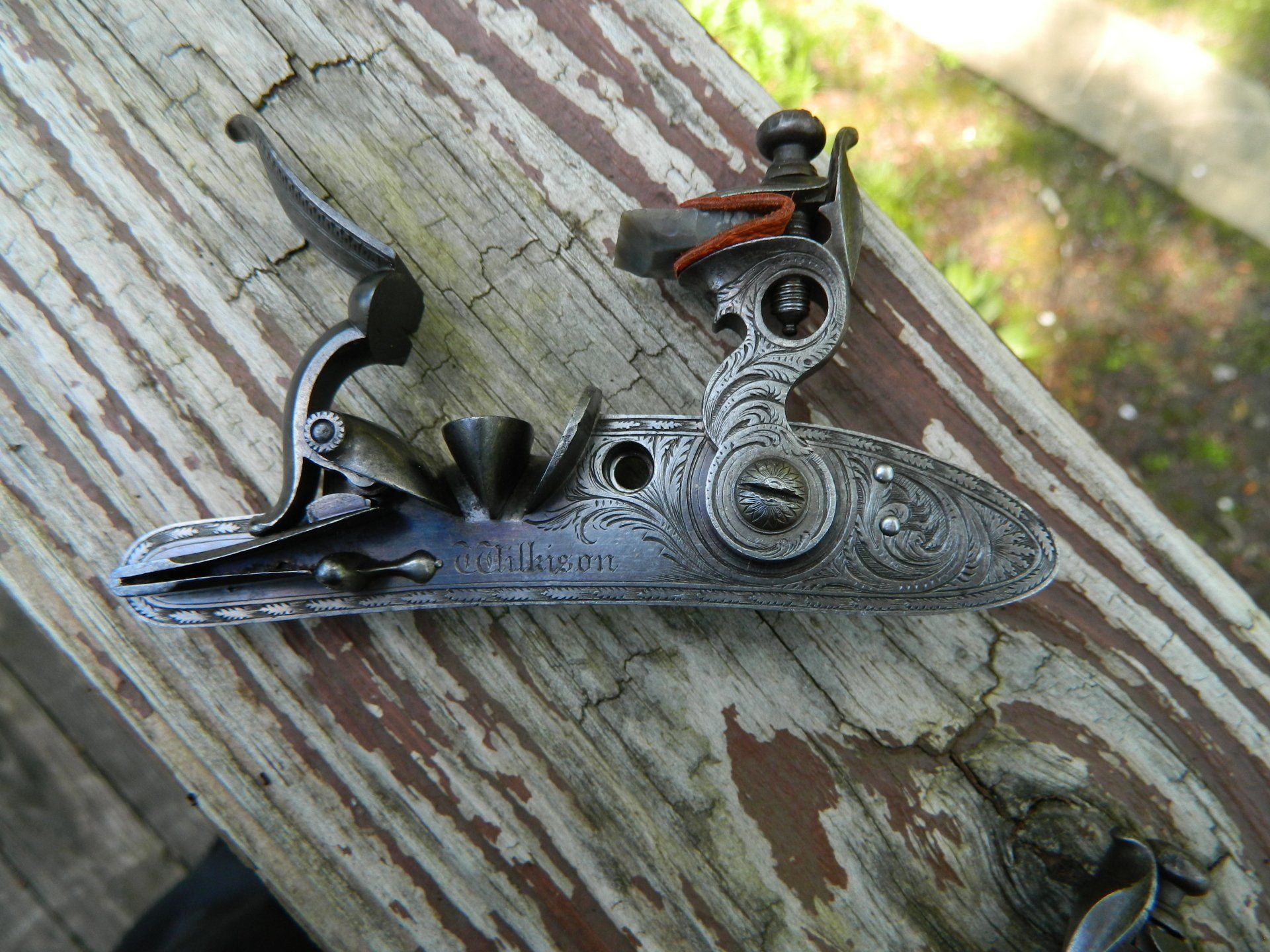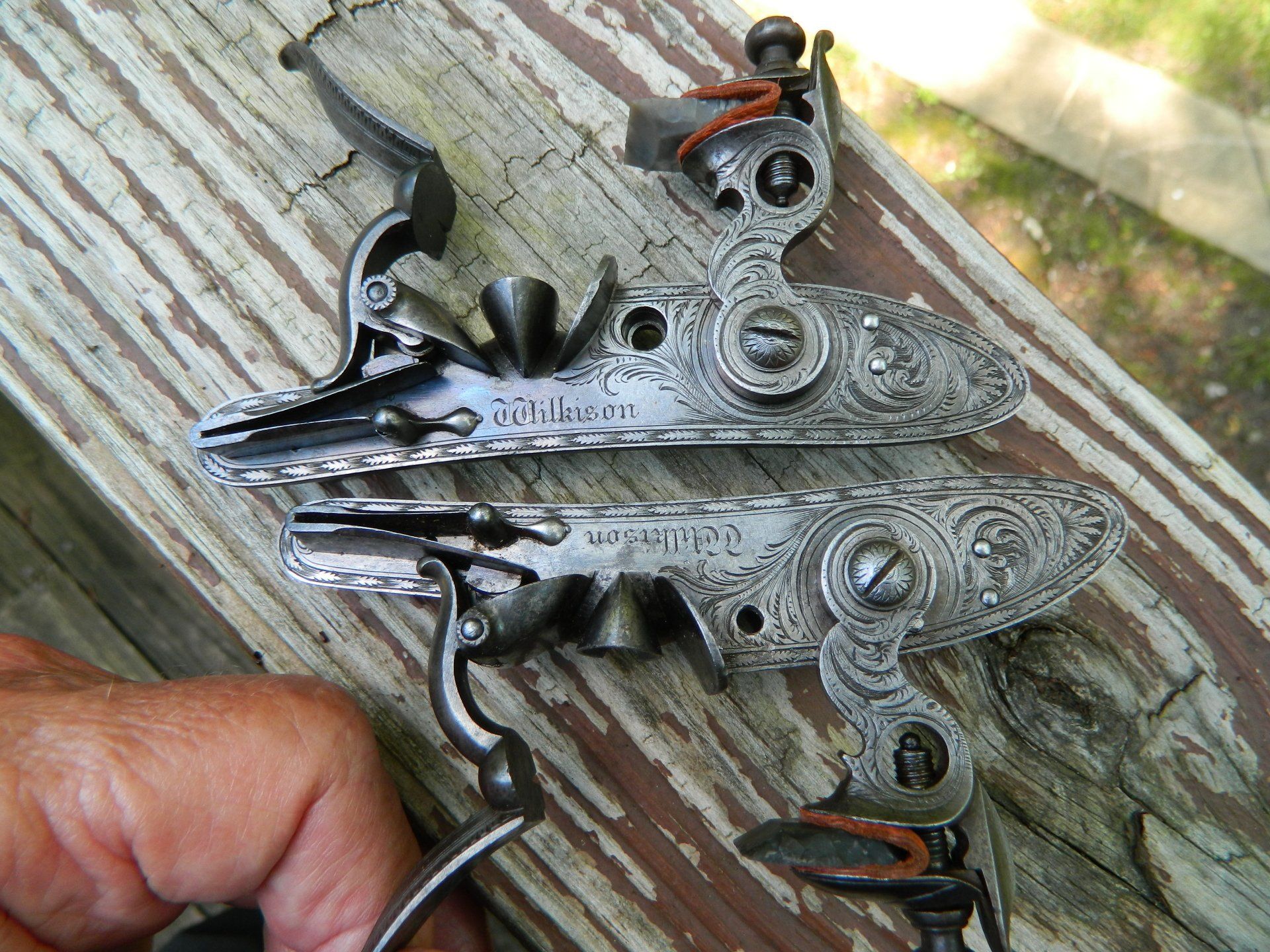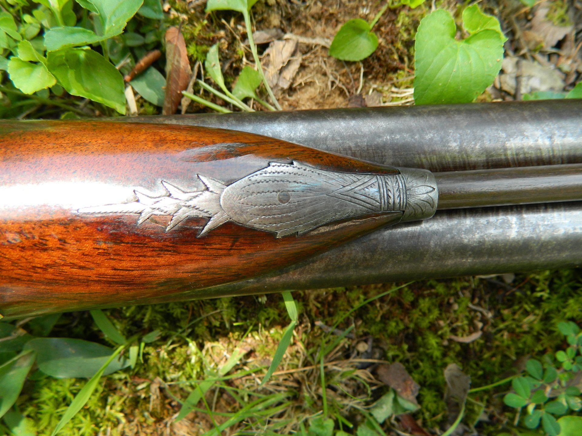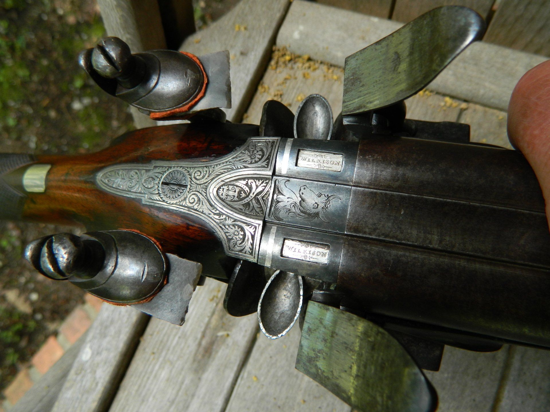 John Manton and Son, London. An absolutely stunning 14-bore, cased double barreled, Flintlock Sporting Gun, #10571, made in 1830 for the Earl of Plymouth, Robert Henry Clive (1789-1854), grandson of Robert Clive (1725-1774) who was also known as "Clive of India". Weight: 7 lbs. Stock dimensions: 14 ¼" LOP. Superb 31 3/4" Damascus barrels with absolutely pristine breeches, unaltered bores (.701"/.701"), and thick walls (.056"/.056") at the muzzles, retaining most of the original external finish. Stepped-in breeches engraved and with platinum lines inlaid fore-and-aft also have platinum-lined touch holes and retain much of the original hardening colors. The ramrod is original as is the spare that accompanies the gun. The peerless quality locks, retaining much original finish have deep-V pans (without platinum divider bars) and gooseneck cocks. The hammers have been struck a few times but, like the breeches, show little-or-no evidence of ever being used in the field. Absolutely mechanically perfect with extremely powerful main and feather springs as you would expect from this Maker! Beautifully engraved iron mounts retain much of the original dark blue finish with some of the finish worn off the trigger guard tang and butt plate. Nicely figured walnut stock has a few handling marks and a minor repair to the mortise just above the bar of the right lock. Overall the stock retains virtually all the original finish with sharp, crisp, checkering at the wrist. Silver wrist escutcheon, showing no wear, is engraved with a griffin and torse over the owners initials, "RHC". The whole in the original mahogany case with a complete compliment of original accessories including spare ramrod, stout 3-piece loading rod, Hawksley pigskin leather-covered powder flask signed in ink by hand, " G.H.W. Windsor-Clive", over an abbreviation for the Coldstream Guards referring to Lieutenant Colonel George Herbert Windsor Windsor-Clive (1835-1918), the second son of Robert Clive and younger brother of the original owner. Also included in the case are a leather flint wallet containing spare flints and two spare side nails, wad punch, double turnscrew, pan brush, and original key to the case ... all in fine condition. Overall a magnificent, incredibly rare, original set, with impeccable provenance, mechanically absolutely perfect, the whole remaining in superb condition throughout, and suitable for the finest collection or use in the field today. Not likely you will ever see a finer example offered for sale !! Provenance: Made in 1830 for the Earl of Plymouth, Robert Henry Clive (1789-1854), grandson of Robert Clive (1725-1774) who was also known as "Clive of India". Purchased by my friend, Norm Blank, around 1962 directly from the Earl of Plymouth's estate in a sale facilitated by Keith Neal. Ownership passed to Lewis Drake in 2023. SOLD