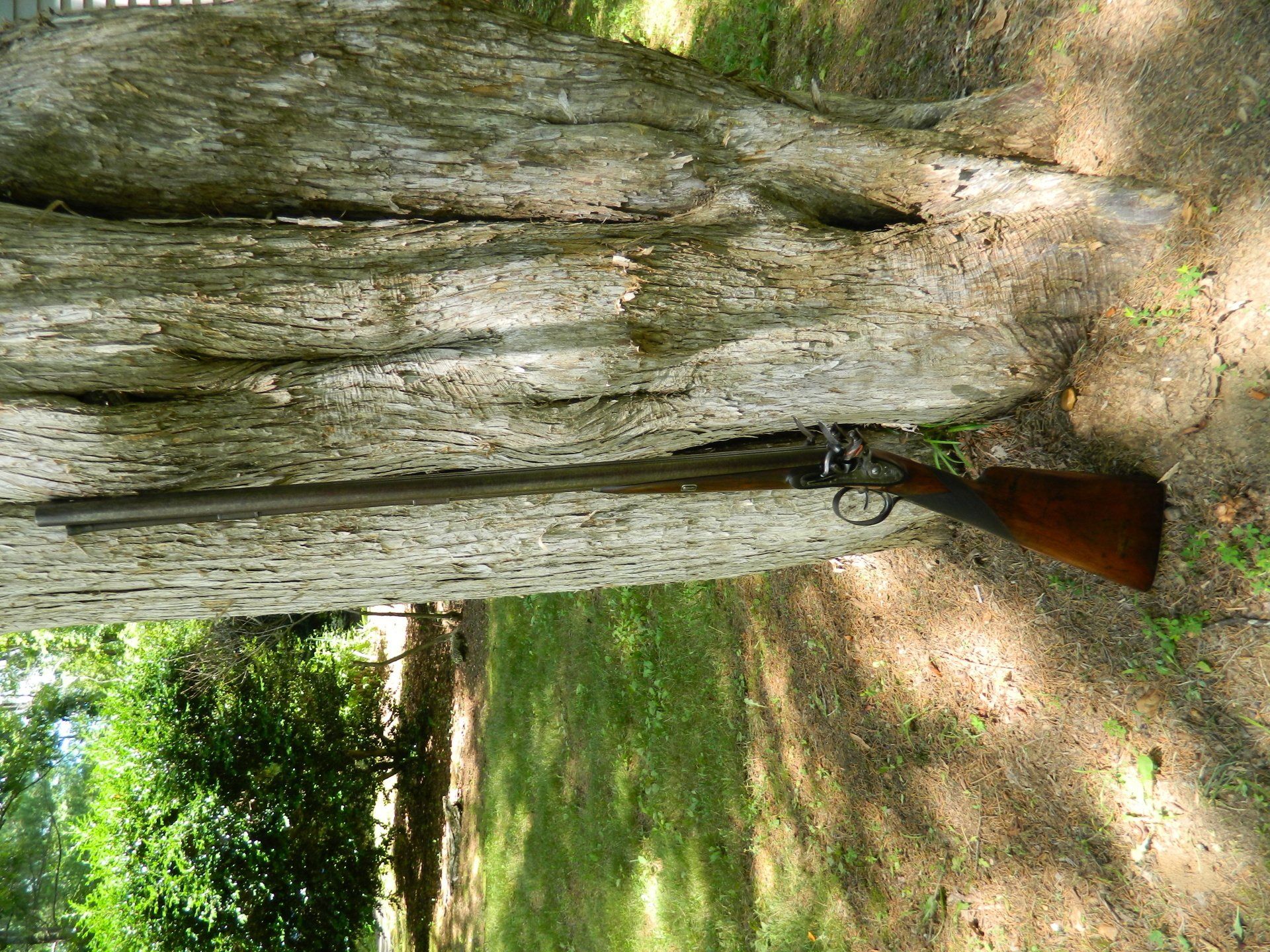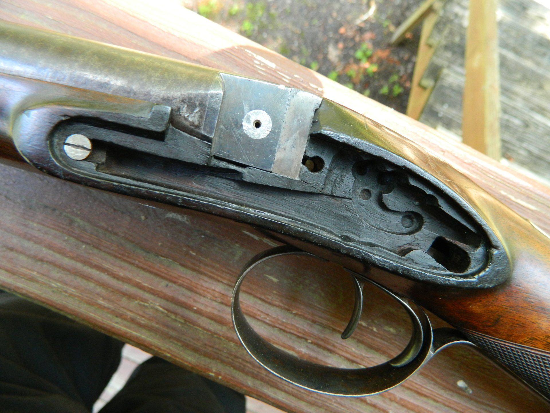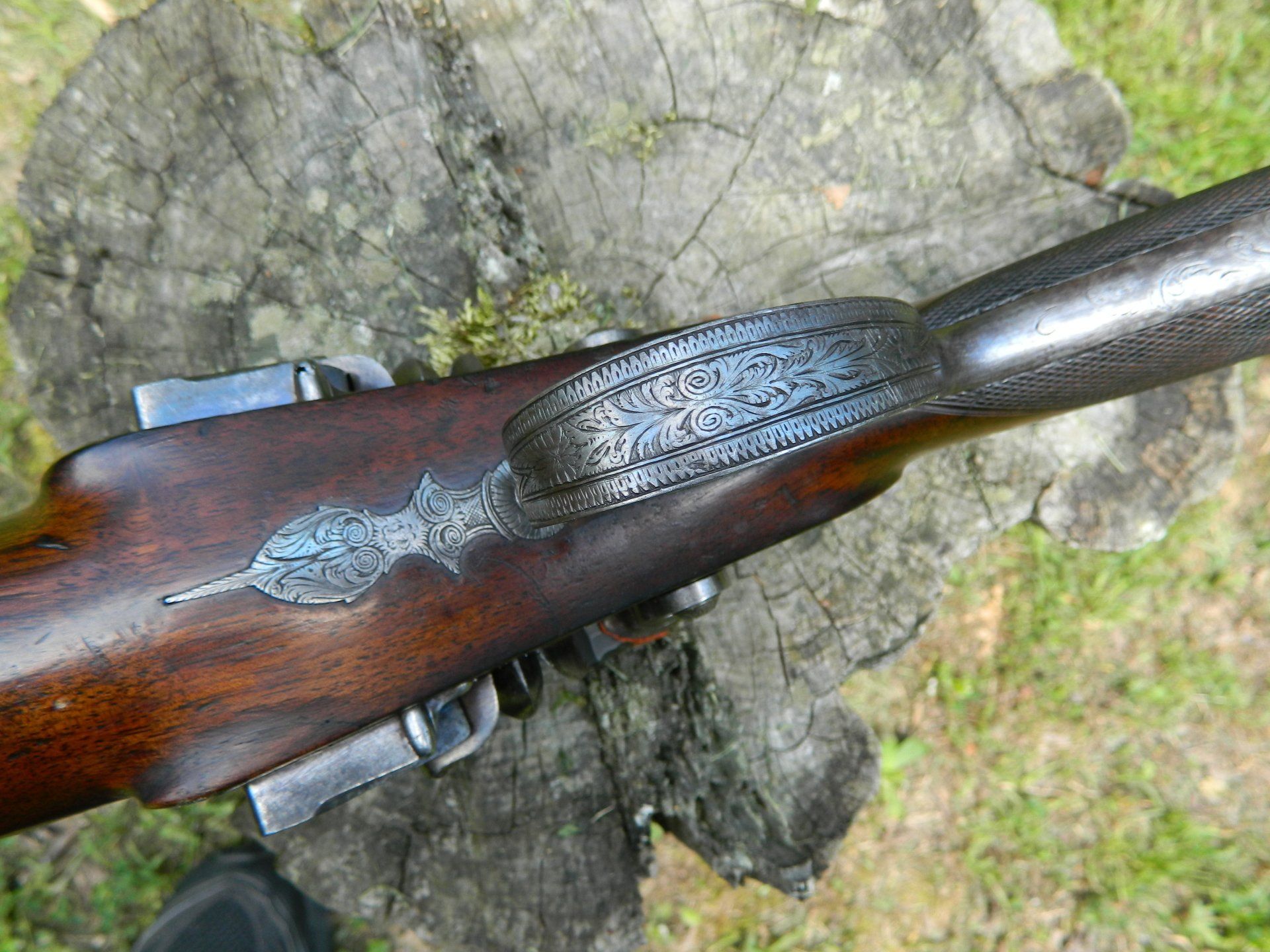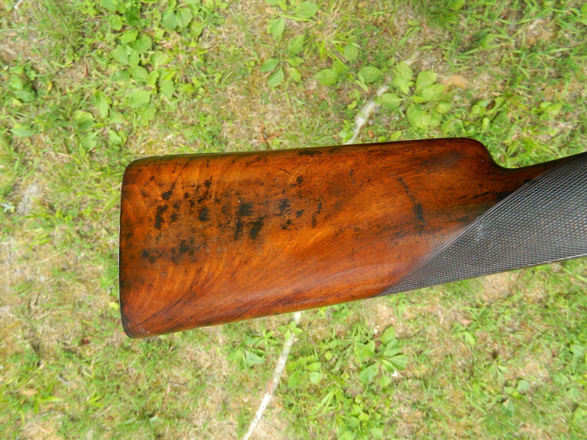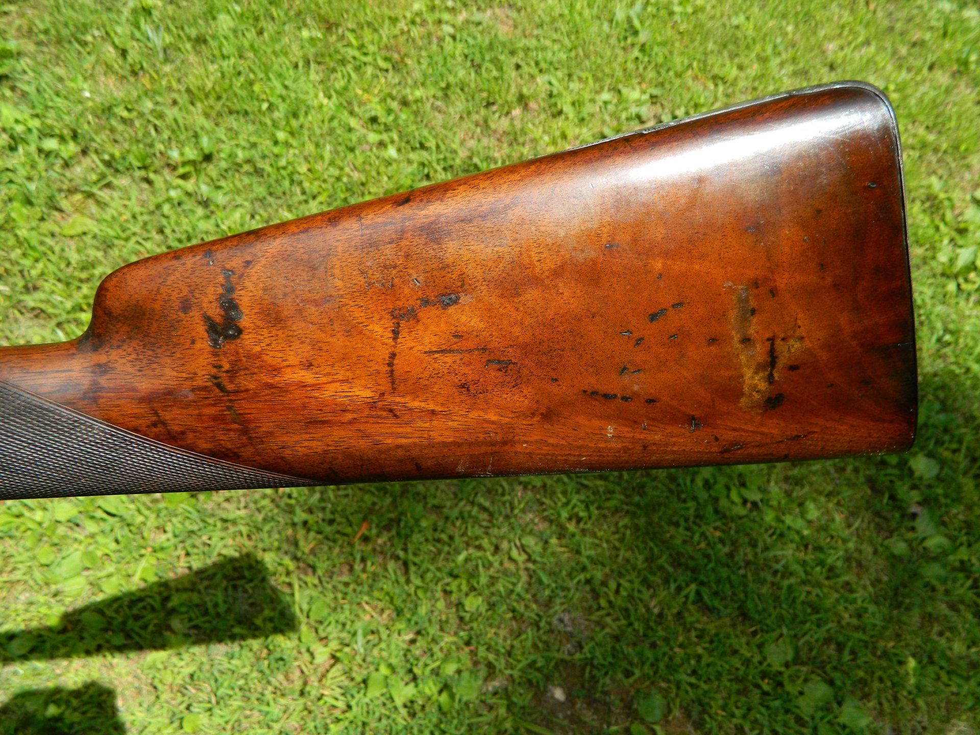 John Manton and Son, London. An absolutely stunning 14-bore, cased double barreled, Flintlock Sporting Gun, #10571, made in 1830 for the Earl of Plymouth, Robert Henry Clive (1789-1854), grandson of Robert Clive (1725-1774) who was also known as "Clive of India". Weight: 7 lbs. Stock dimensions: 14 ¼" LOP. Superb 31 3/4" Damascus barrels with absolutely pristine breeches, unaltered bores (.701"/.701"), and thick walls (.056"/.056") at the muzzles, retaining most of the original external finish. Stepped-in breeches engraved and with platinum lines inlaid fore-and-aft also have platinum-lined touch holes and retain much of the original hardening colors. The ramrod is original as is the spare that accompanies the gun. The peerless quality locks, retaining much original finish have deep-V pans (without platinum divider bars) and gooseneck cocks. The hammers have been struck a few times but, like the breeches, show little-or-no evidence of ever being used in the field. Absolutely mechanically perfect with extremely powerful main and feather springs as you would expect from this Maker! Beautifully engraved iron mounts retain much of the original dark blue finish with some of the finish worn off the trigger guard tang and butt plate. Nicely figured walnut stock has a few handling marks and a minor repair to the mortise just above the bar of the right lock. Overall the stock retains virtually all the original finish with sharp, crisp, checkering at the wrist. Silver wrist escutcheon, showing no wear, is engraved with a griffin and torse over the owners initials, "RHC". The whole in the original mahogany case with a complete compliment of original accessories including spare ramrod, stout 3-piece loading rod, Hawksley pigskin leather-covered powder flask signed in ink by hand, " G.H.W. Windsor-Clive", over an abbreviation for the Coldstream Guards referring to Lieutenant Colonel George Herbert Windsor Windsor-Clive (1835-1918), the second son of Robert Clive and younger brother of the original owner. Also included in the case are a leather flint wallet containing spare flints and two spare side nails, wad punch, double turnscrew, pan brush, and original key to the case ... all in fine condition. Overall a magnificent, incredibly rare, original set, with impeccable provenance, mechanically absolutely perfect, the whole remaining in superb condition throughout, and suitable for the finest collection or use in the field today. Not likely you will ever see a finer example offered for sale !! Provenance: Made in 1830 for the Earl of Plymouth, Robert Henry Clive (1789-1854), grandson of Robert Clive (1725-1774) who was also known as "Clive of India". Purchased by my friend, Norm Blank, around 1962 directly from the Earl of Plymouth's estate in a sale facilitated by Keith Neal. Ownership passed to Lewis Drake in 2023. SOLD