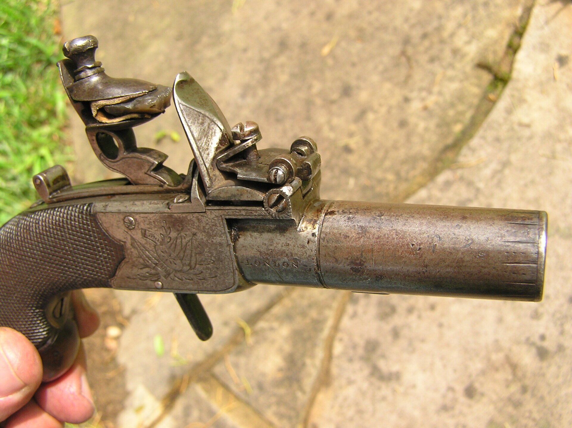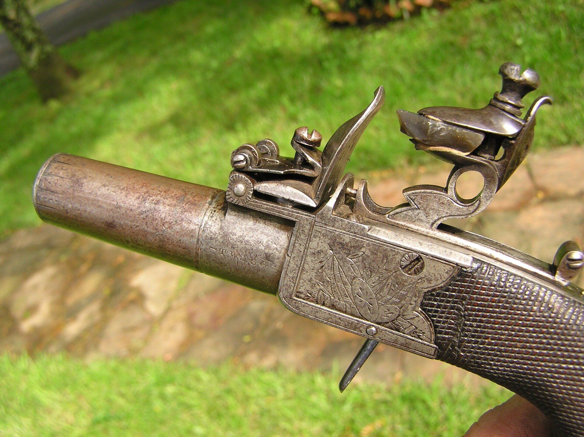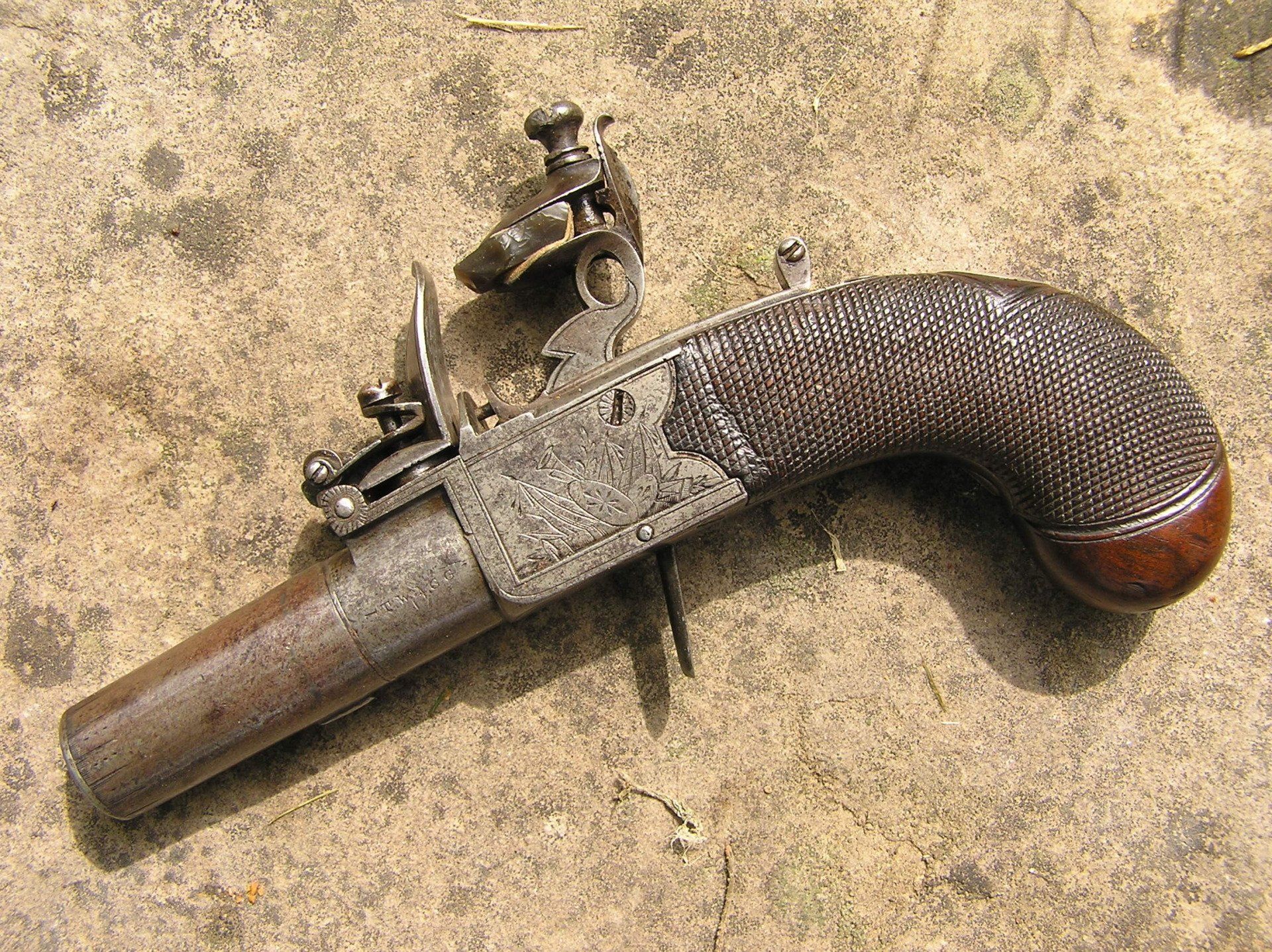 John Twigg, London. Exceptionally fine and rare early breech-loading, boxlock, .49 cal., flintlock turn-off, folding trigger pocket pistol, ca. 1765. Overall length 6 ¼”. Nicely engraved breech with Twigg’s first form of signature used during the period 1760 - 1770. Highest quality sliding safety incorporating both the cock and frizzen. The rounded butt stock with vacant silver escutcheon is very finely checkered. Additionally, this superb little gun has a roller frizzen, the purpose of which was to reduce friction providing for a faster ignition sequence. This feature was commonly used on the finest, full-size, pistols and long guns of the day, however, this treatment was almost never lavished upon pocket pistols and is a testament to Twigg’s legendary attention to detail and quality in every firearm that bore his signature. Overall crisp, mechanically perfect, with immaculate fit and finish throughout and still retaining traces of the original finish. A superb example of this type of firearm.