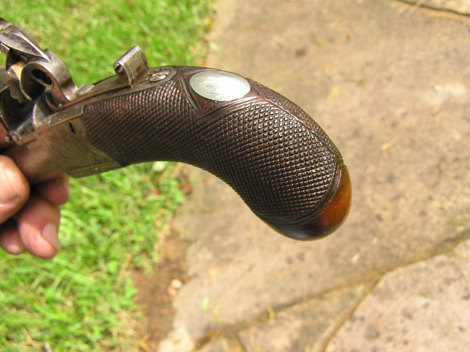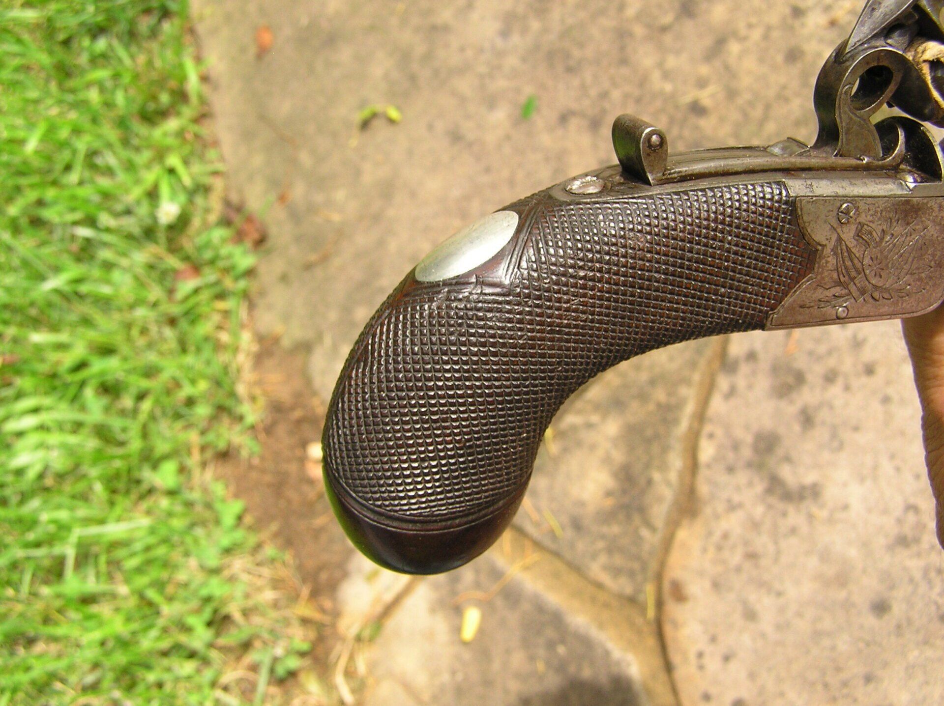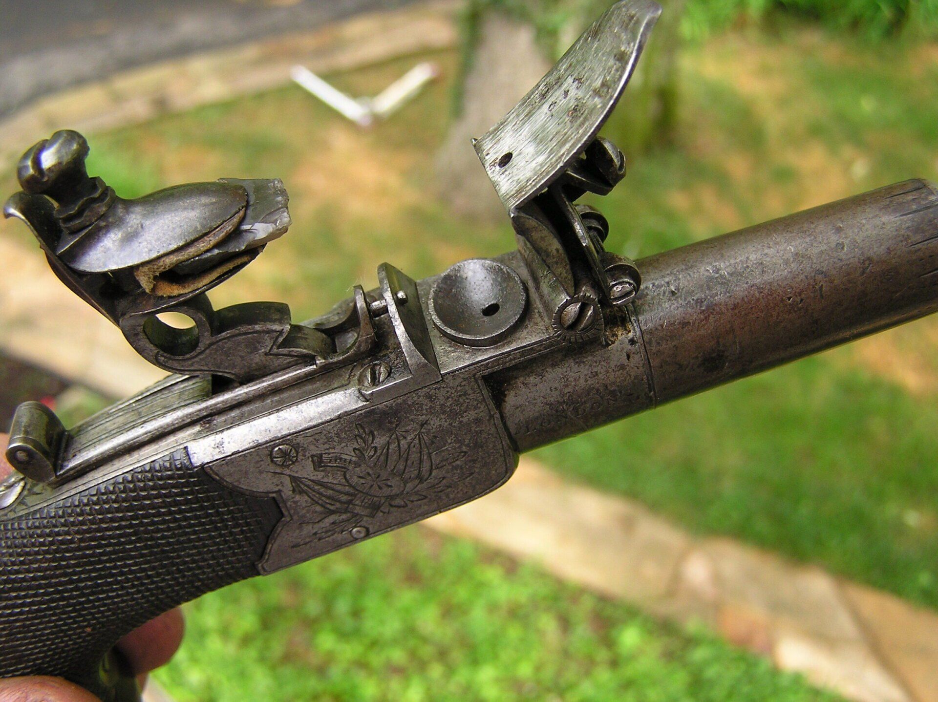 John Twigg, London. Exceptionally fine and rare early breech-loading, boxlock, .49 cal., flintlock turn-off, folding trigger pocket pistol, ca. 1765. Overall length 6 ¼”. Nicely engraved breech with Twigg’s first form of signature used during the period 1760 - 1770. Highest quality sliding safety incorporating both the cock and frizzen. The rounded butt stock with vacant silver escutcheon is very finely checkered. Additionally, this superb little gun has a roller frizzen, the purpose of which was to reduce friction providing for a faster ignition sequence. This feature was commonly used on the finest, full-size, pistols and long guns of the day, however, this treatment was almost never lavished upon pocket pistols and is a testament to Twigg’s legendary attention to detail and quality in every firearm that bore his signature. Overall crisp, mechanically perfect, with immaculate fit and finish throughout and still retaining traces of the original finish. A superb example of this type of firearm.