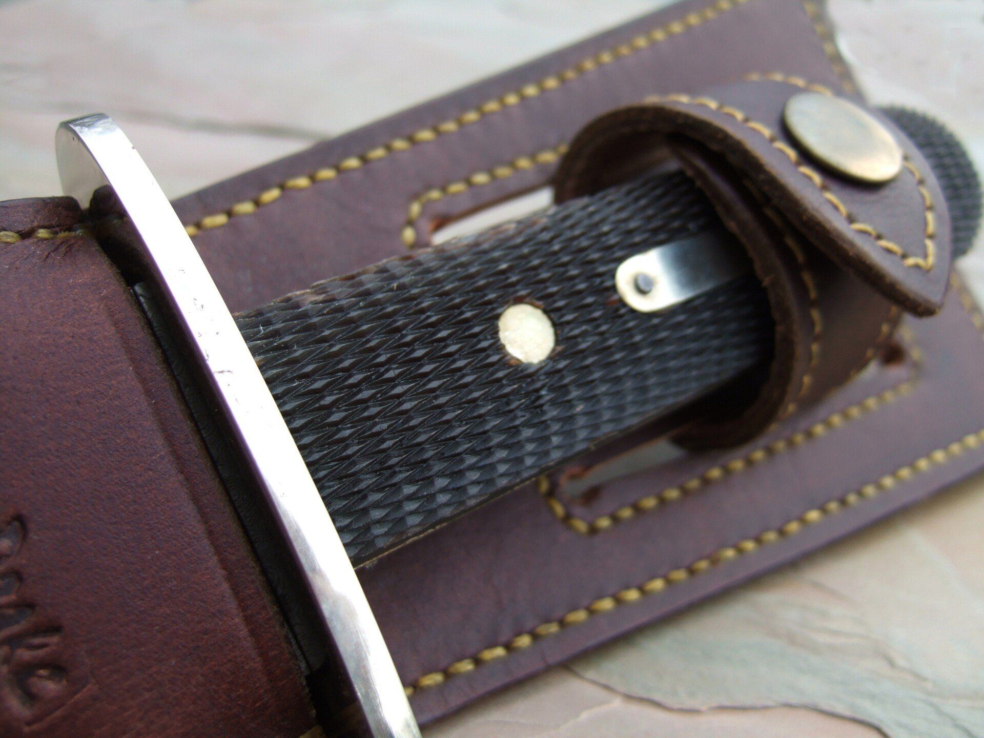 Overall length is 13 with a 2" blade width, and heavy enough for light wood chopping duty. This knife is an ideal companion to carry in the bush both for general camp use and for defense. Solid brass quillon and genuine checkered buffalo horn handle. Comes in its own leather sheath. Available nowhere else.