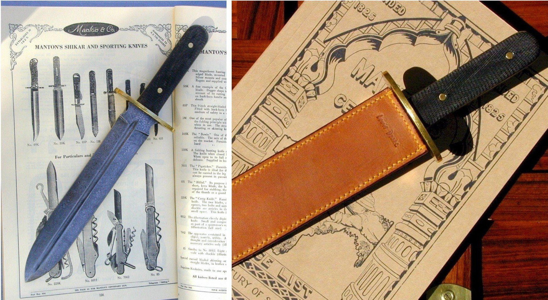 Beautiful Damascus steel, double-edged, spear point camp knife reproduced by us right out of the 1925 Manton "Centenary" Catalogue. Forged entirely by hand by our own old world craftsmen and not to be confused with most of the cheap "Damascus knives" on the market today.