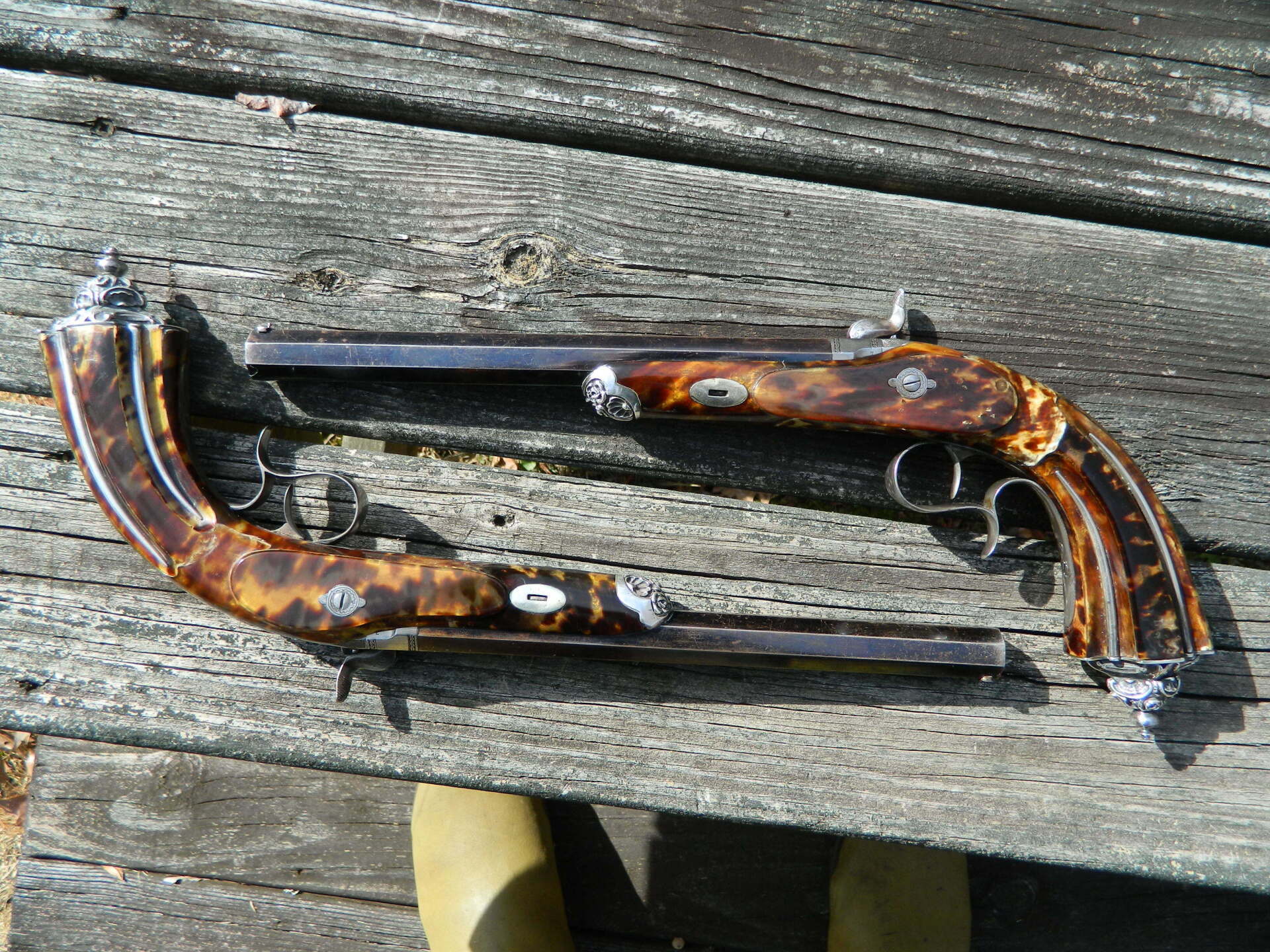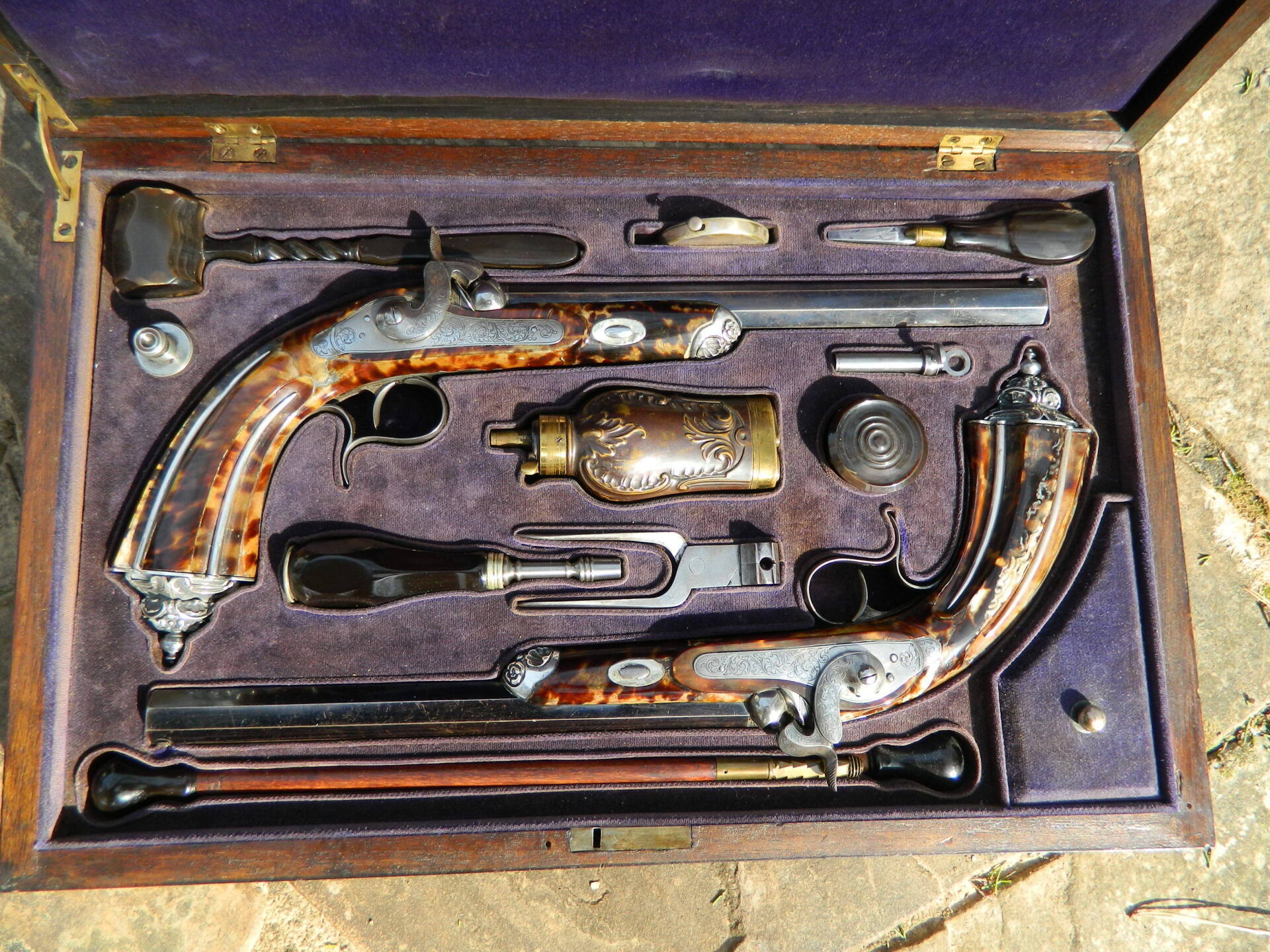 Wonderful Cased Pair of French percussion Target Pistols, stocked in Tortoise-shell, ca.1850. Approximately .50 caliber, 10 ½”, barrels retaining much of the original brilliant black finish. The butt and nose caps are silver, as are the decorative silver bars running up the carved recesses in the pistol grips. The process for overlaying the stocks with Tortoise Shell is interesting. First, the underlying wood stock is shaped undersize to allow for a veneer of tortoise shell. However, before the tortoise shell, a layer of pure gold leaf is applied over the exterior of the stock. Then the layer of tortoise shell is applied over the gold. The purpose of the gold is to supply a mirror surface to reflect the incoming light back up through the translucent tortoise shell enhancing the rich color and lustrous polished finish. Overall, the effect is quite stunning. Beautiful original burl walnut Maker’s case with a complete compliment of original accessories. Overall an absolutely stunning set and a great rarity.