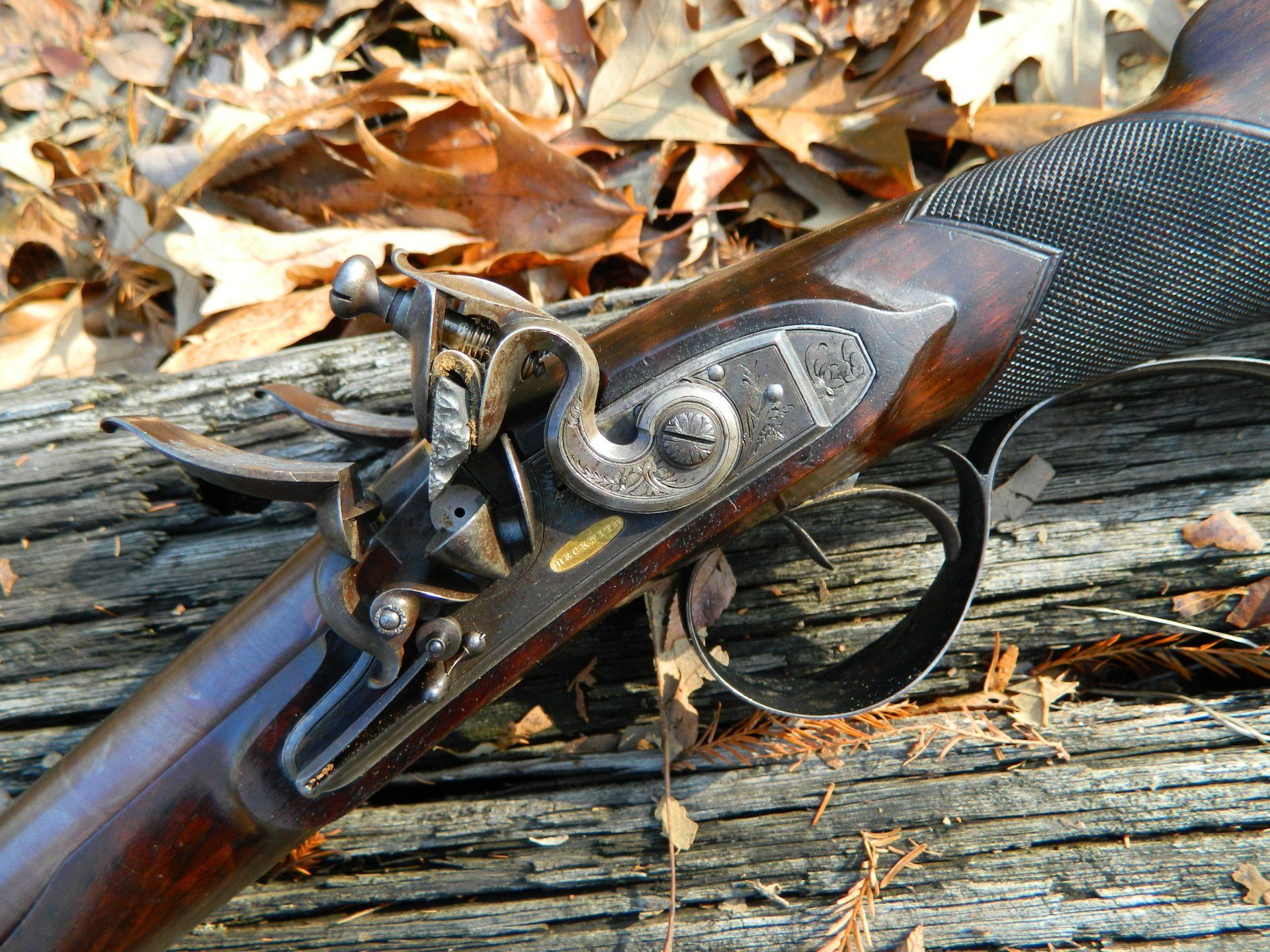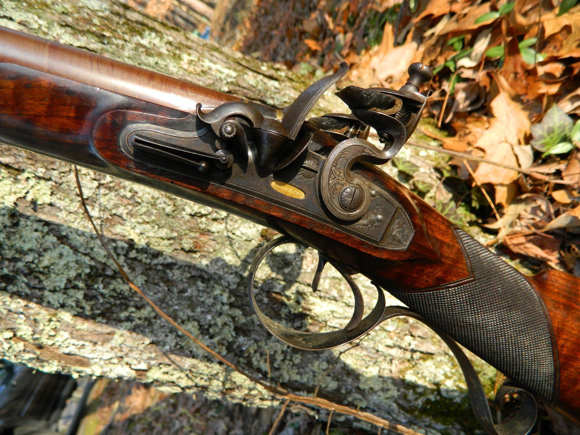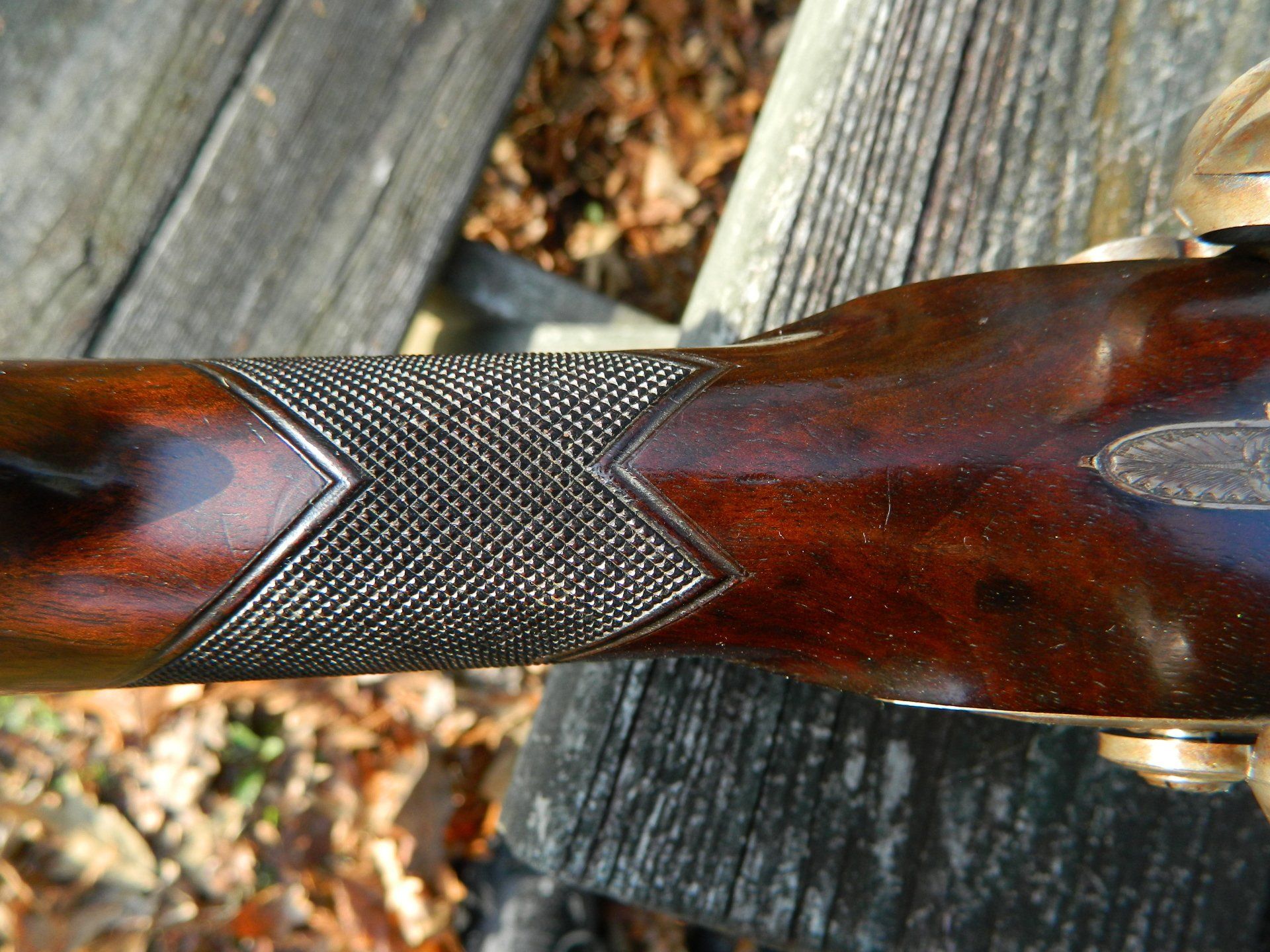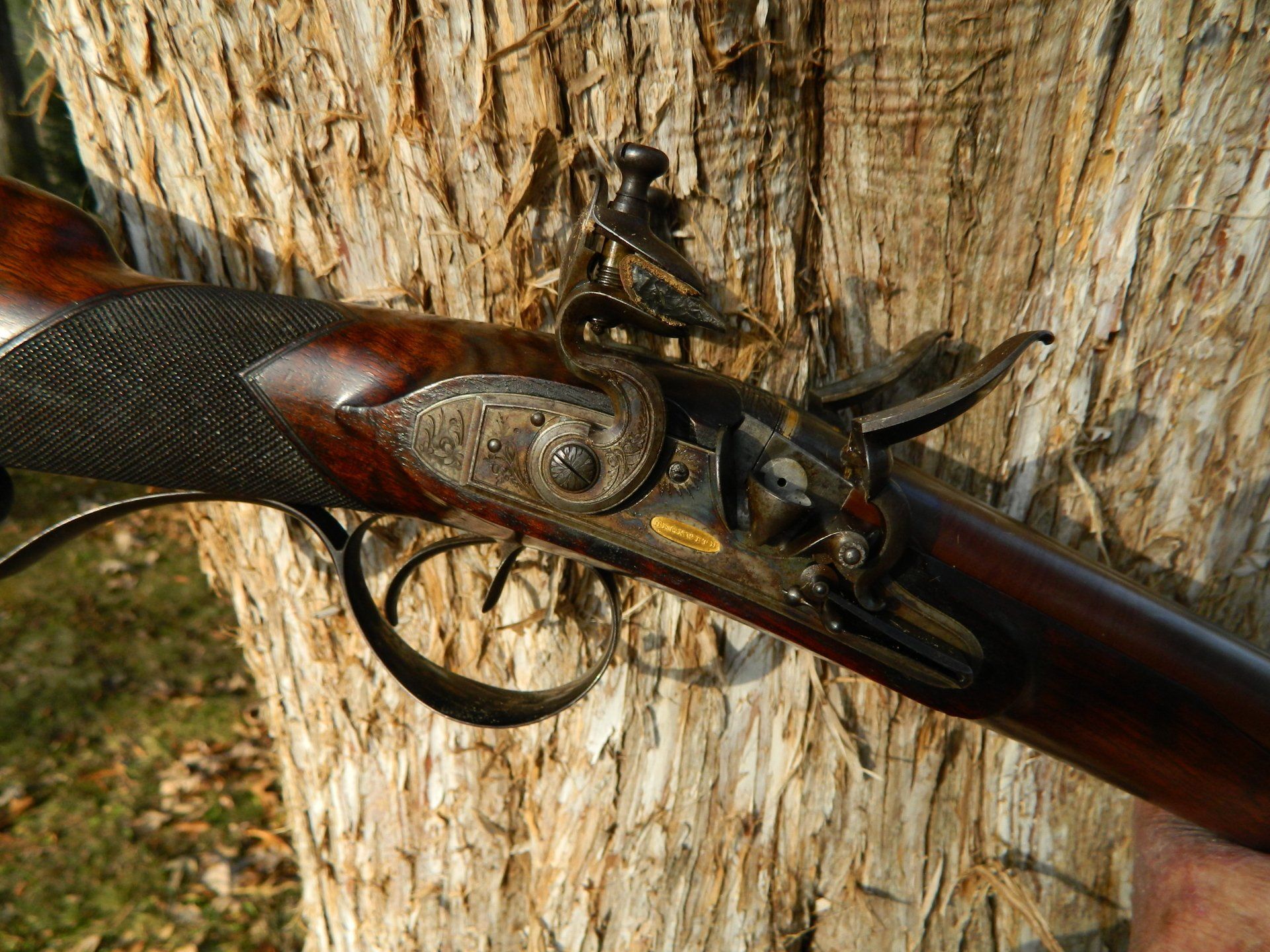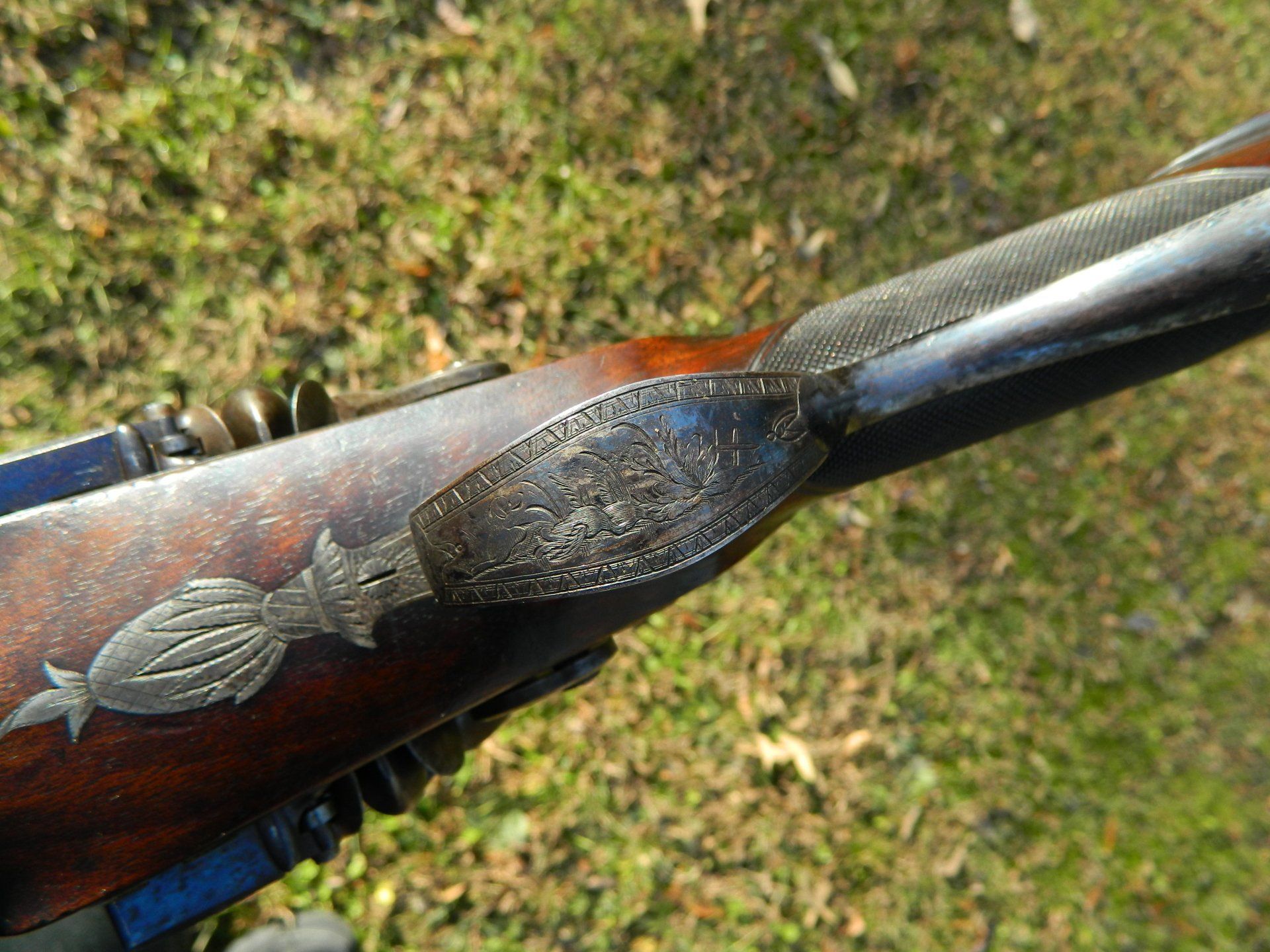 William Beckwith, London. Exquisite 15-bore, double-barreled flintlock Sporting Gun, #1215, ca. 1820. Weight: 6 ¾ Lbs. Stock Dimensions: 14 ½’x 1 1/8”x 2 3/8”x ¼” cast-on. Superb 30 ½” barrels with absolutely brilliant breeches and bores (.728”/.729”) and retaining virtually 100% of the original brown finish. Original ramrod serial numbered to the gun. Sloped-in breeches, for fast ignition, with two gold bands and platinum lined touch-holes, all showing not a speck of corrosion and no evidence of use. The beautifully engraved and fit up false breech retains most of it’s original hardening colors as well. Immaculate locks of absolutely peerless quality and function throughout retain most of their original finish inside and out. The frizzens have obviously been struck a few times but show no significant wear and no other signs of use and no corrosion whatever to the very complex, and incredibly difficult to fabricate, venting systems with-in the self-priming pan covers. Each lock plate with elongated oval, gold-inlaid, poincon with maker’s name … condition mint. Some flaking of the original brilliant black finish on the iron mounts has occurred, however, much of the finish remains and the engraving is crisp and clean with no significant corrosion anywhere on the gun except some small isolated areas in the bottoms of the pans. The beautifully figured walnut stock, amazingly, retains all of it’s original finish throughout, with a few very minor handling marks, and all of the checkering at the wrist is absolutely perfect as if it had been cut yesterday. You will note the unusual cut-out areas on either side of the forestock right about where the shooter’s hand would be. This was obviously intentional and I can think of no other use for it other than to serve as a tactile register for exact placement of the shooter’s hand. I have never seen that before and any thoughts on that are welcome.