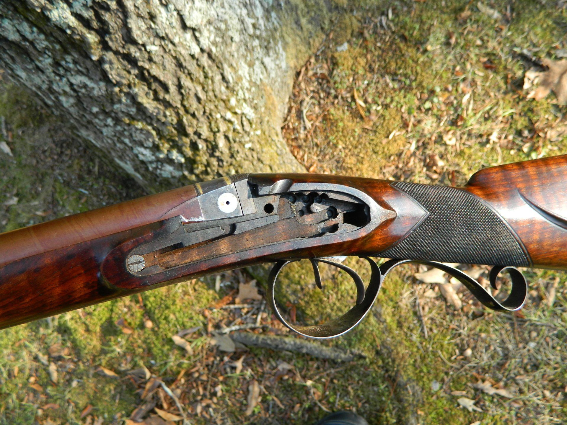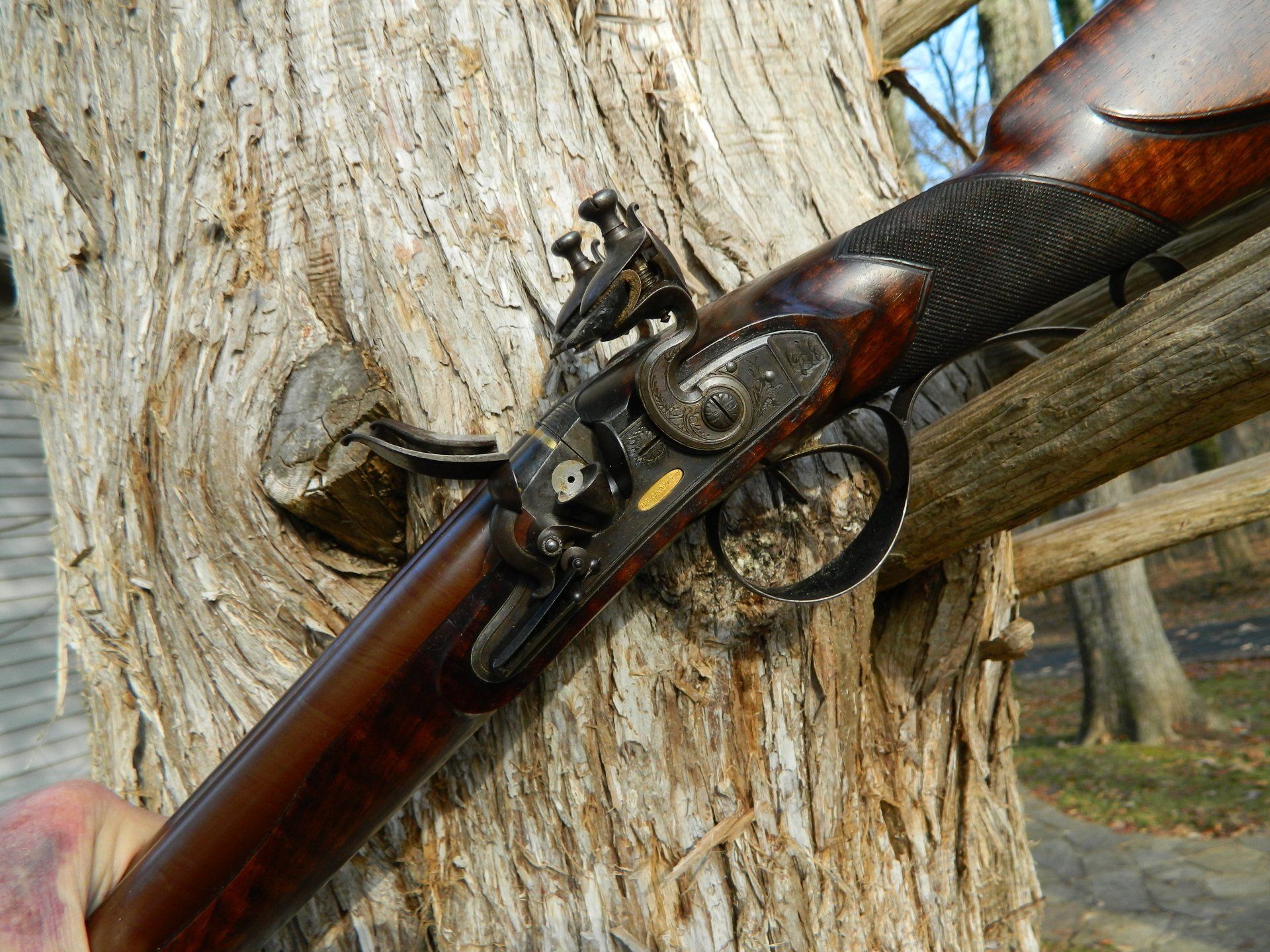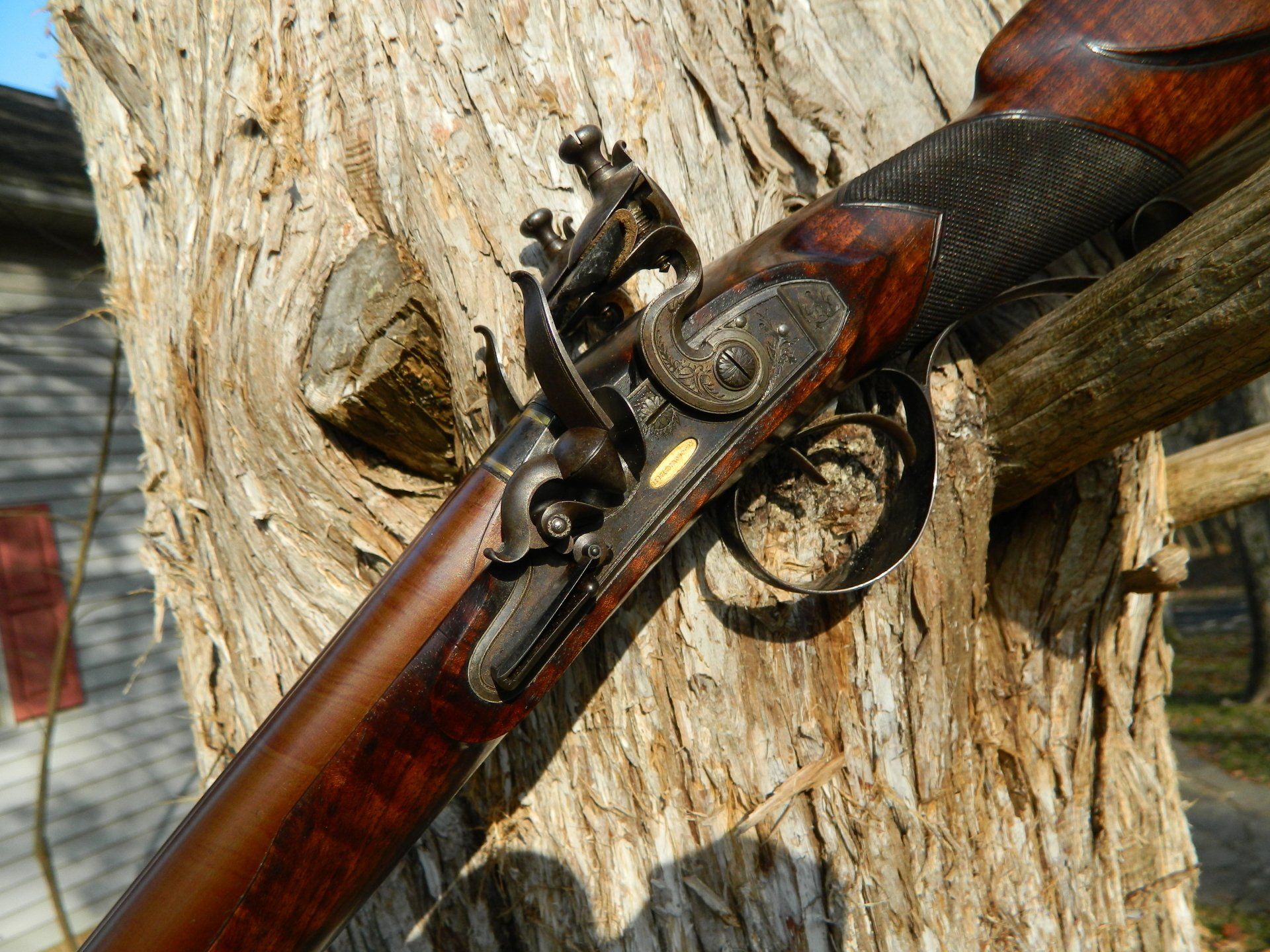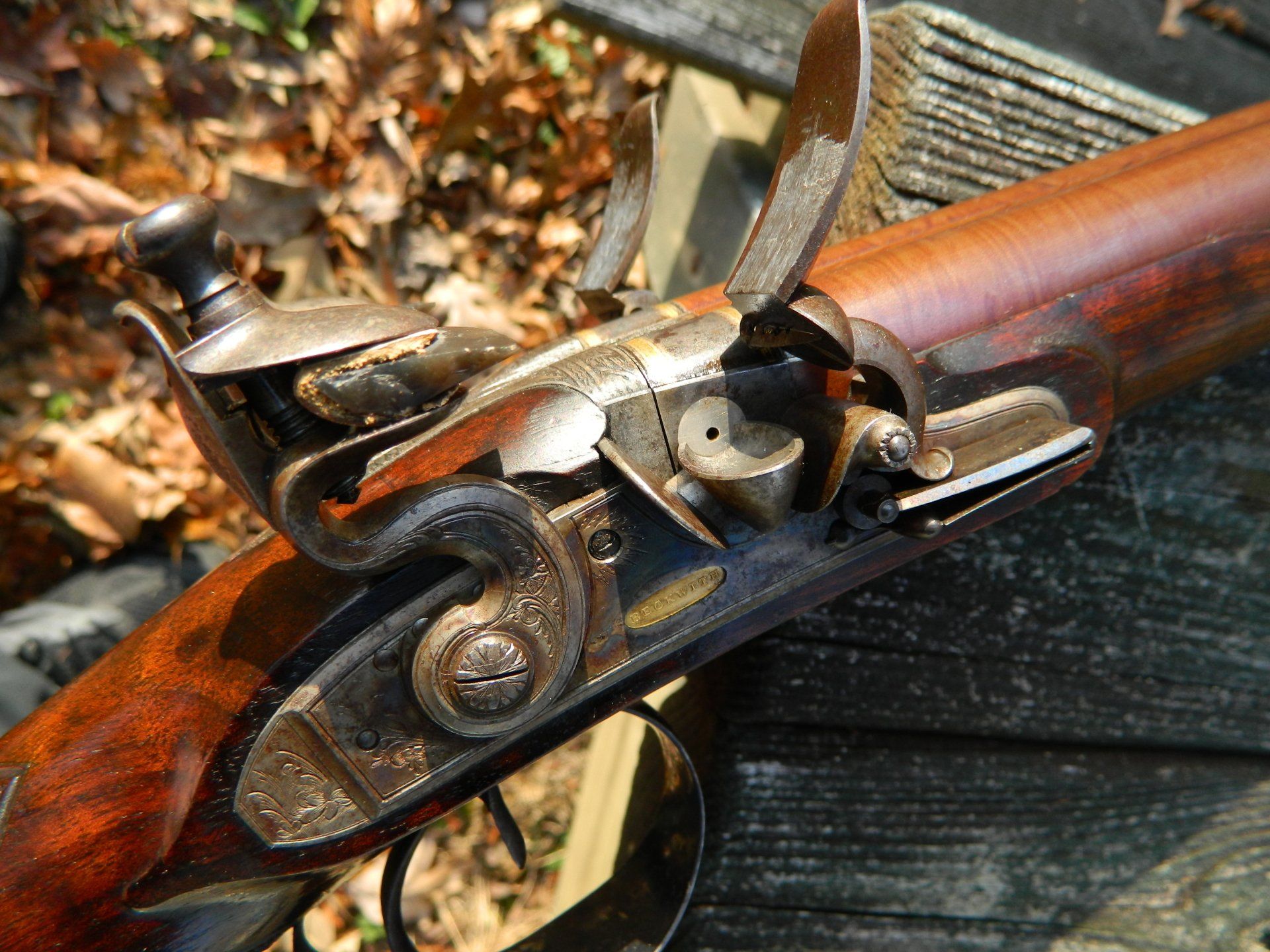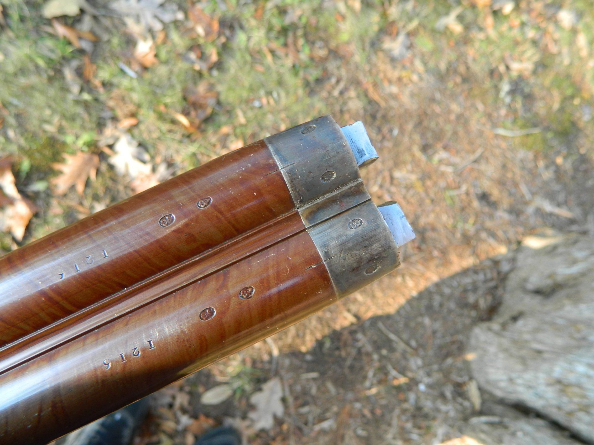 William Beckwith, London. Exquisite 15-bore, double-barreled flintlock Sporting Gun, #1215, ca. 1820. Weight: 6 ¾ Lbs. Stock Dimensions: 14 ½’x 1 1/8”x 2 3/8”x ¼” cast-on. Superb 30 ½” barrels with absolutely brilliant breeches and bores (.728”/.729”) and retaining virtually 100% of the original brown finish. Original ramrod serial numbered to the gun. Sloped-in breeches, for fast ignition, with two gold bands and platinum lined touch-holes, all showing not a speck of corrosion and no evidence of use. The beautifully engraved and fit up false breech retains most of it’s original hardening colors as well. Immaculate locks of absolutely peerless quality and function throughout retain most of their original finish inside and out. The frizzens have obviously been struck a few times but show no significant wear and no other signs of use and no corrosion whatever to the very complex, and incredibly difficult to fabricate, venting systems with-in the self-priming pan covers. Each lock plate with elongated oval, gold-inlaid, poincon with maker’s name … condition mint. Some flaking of the original brilliant black finish on the iron mounts has occurred, however, much of the finish remains and the engraving is crisp and clean with no significant corrosion anywhere on the gun except some small isolated areas in the bottoms of the pans. The beautifully figured walnut stock, amazingly, retains all of it’s original finish throughout, with a few very minor handling marks, and all of the checkering at the wrist is absolutely perfect as if it had been cut yesterday. You will note the unusual cut-out areas on either side of the forestock right about where the shooter’s hand would be. This was obviously intentional and I can think of no other use for it other than to serve as a tactile register for exact placement of the shooter’s hand. I have never seen that before and any thoughts on that are welcome.