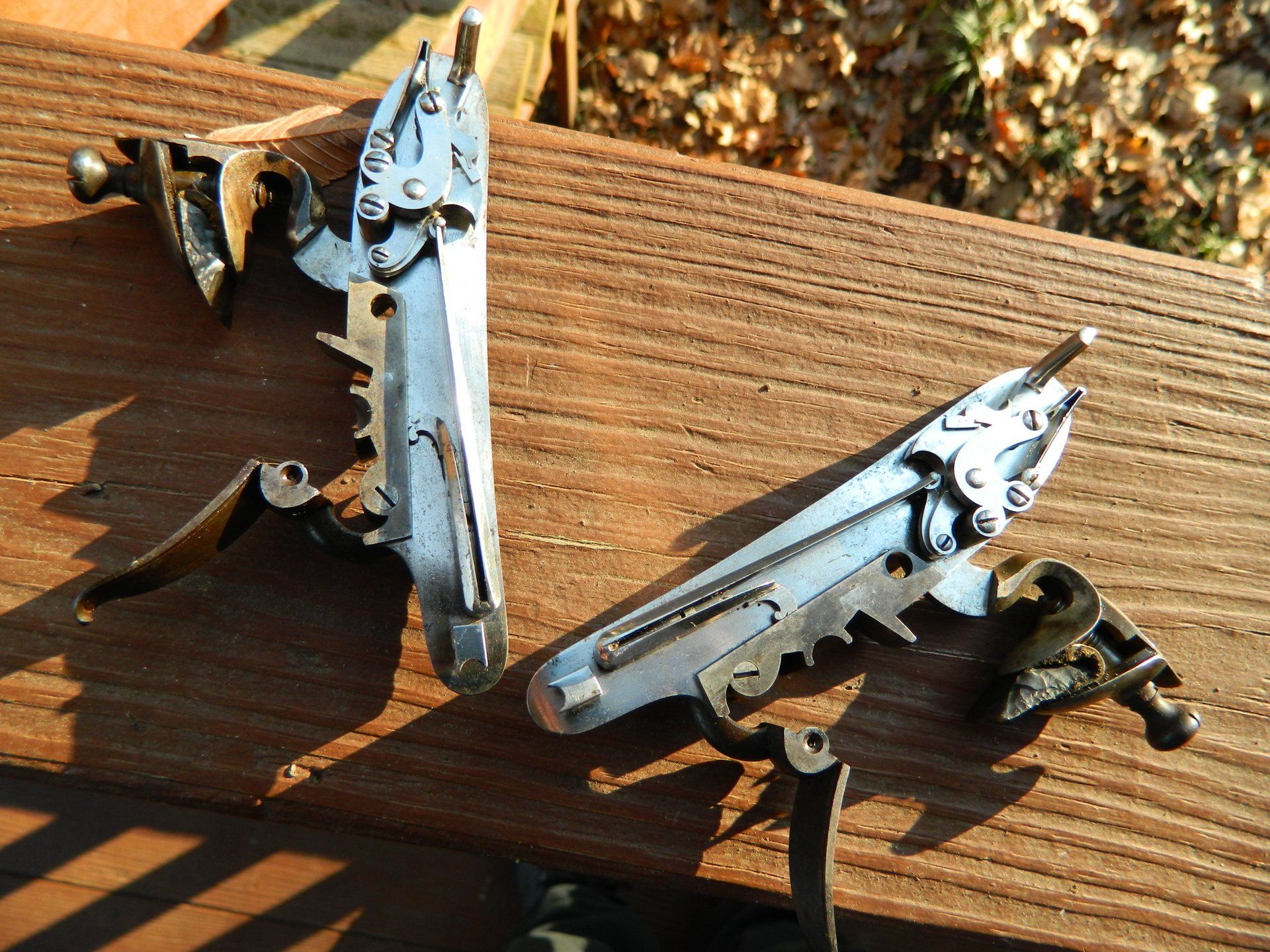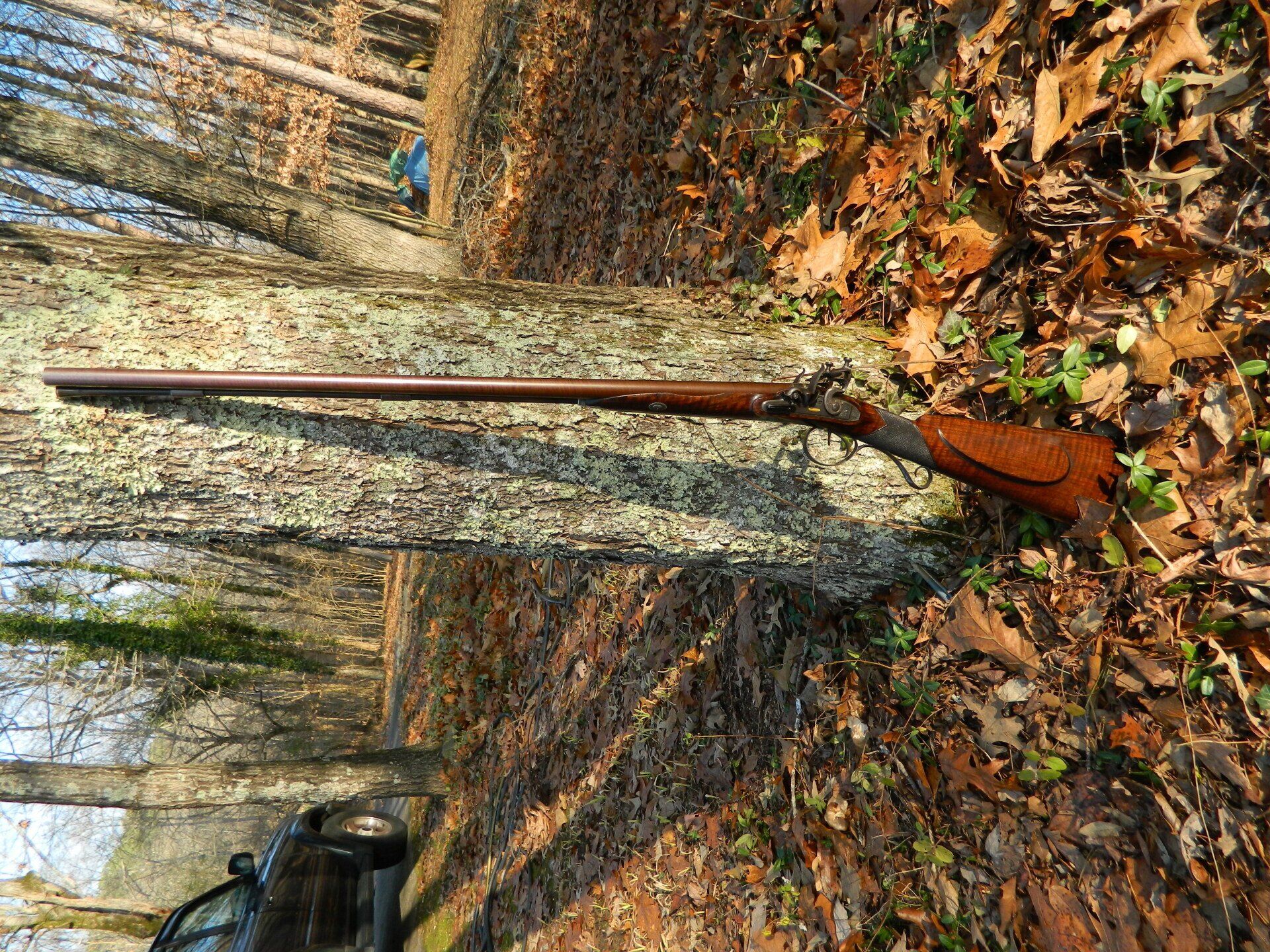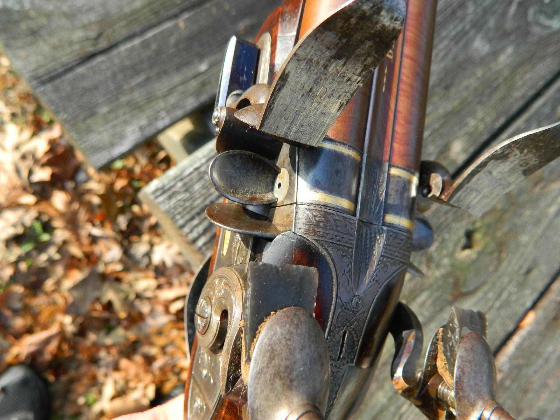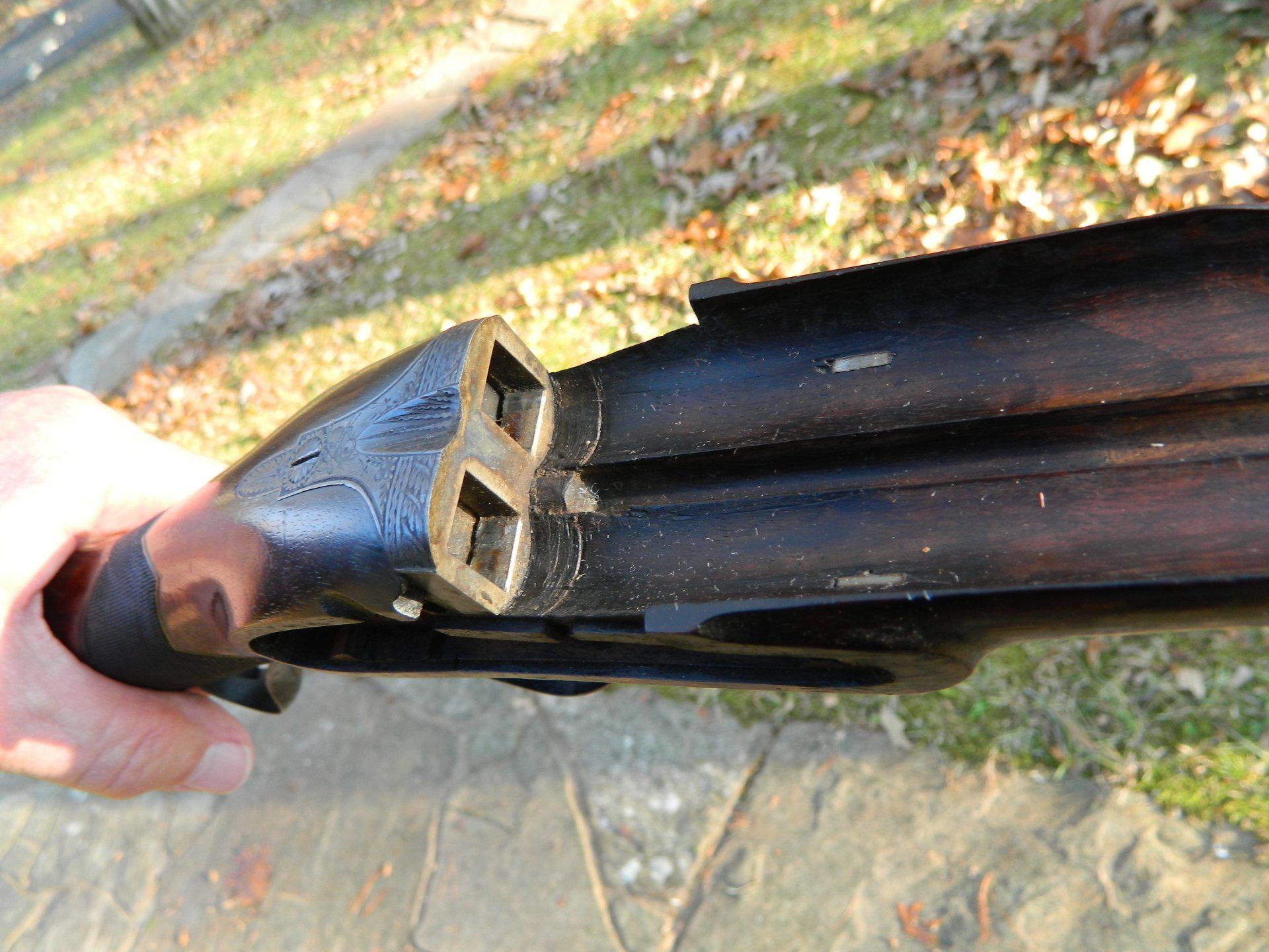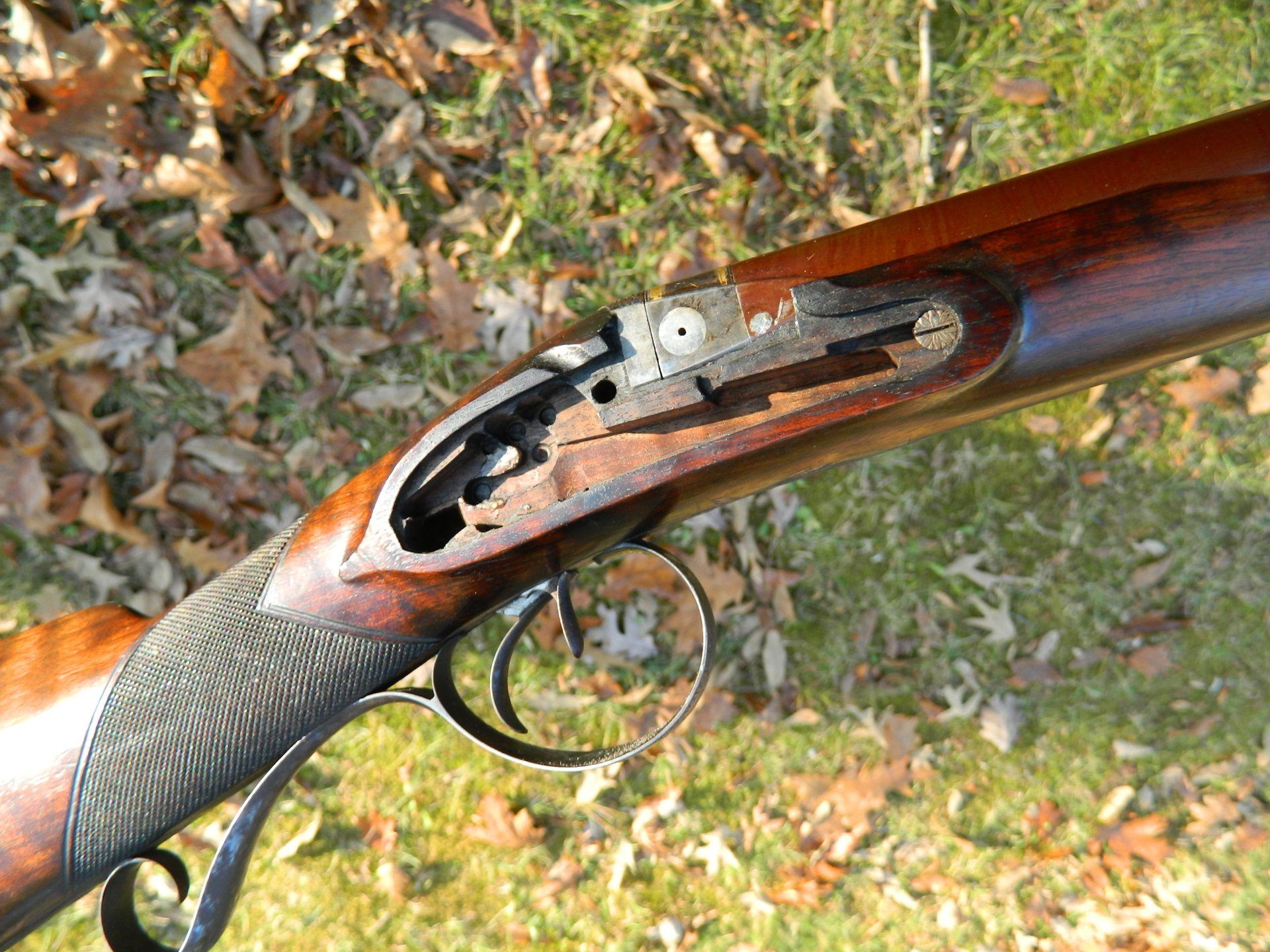 William Beckwith, London. Exquisite 15-bore, double-barreled flintlock Sporting Gun, #1215, ca. 1820. Weight: 6 ¾ Lbs. Stock Dimensions: 14 ½’x 1 1/8”x 2 3/8”x ¼” cast-on. Superb 30 ½” barrels with absolutely brilliant breeches and bores (.728”/.729”) and retaining virtually 100% of the original brown finish. Original ramrod serial numbered to the gun. Sloped-in breeches, for fast ignition, with two gold bands and platinum lined touch-holes, all showing not a speck of corrosion and no evidence of use. The beautifully engraved and fit up false breech retains most of it’s original hardening colors as well. Immaculate locks of absolutely peerless quality and function throughout retain most of their original finish inside and out. The frizzens have obviously been struck a few times but show no significant wear and no other signs of use and no corrosion whatever to the very complex, and incredibly difficult to fabricate, venting systems with-in the self-priming pan covers. Each lock plate with elongated oval, gold-inlaid, poincon with maker’s name … condition mint. Some flaking of the original brilliant black finish on the iron mounts has occurred, however, much of the finish remains and the engraving is crisp and clean with no significant corrosion anywhere on the gun except some small isolated areas in the bottoms of the pans. The beautifully figured walnut stock, amazingly, retains all of it’s original finish throughout, with a few very minor handling marks, and all of the checkering at the wrist is absolutely perfect as if it had been cut yesterday. You will note the unusual cut-out areas on either side of the forestock right about where the shooter’s hand would be. This was obviously intentional and I can think of no other use for it other than to serve as a tactile register for exact placement of the shooter’s hand. I have never seen that before and any thoughts on that are welcome.